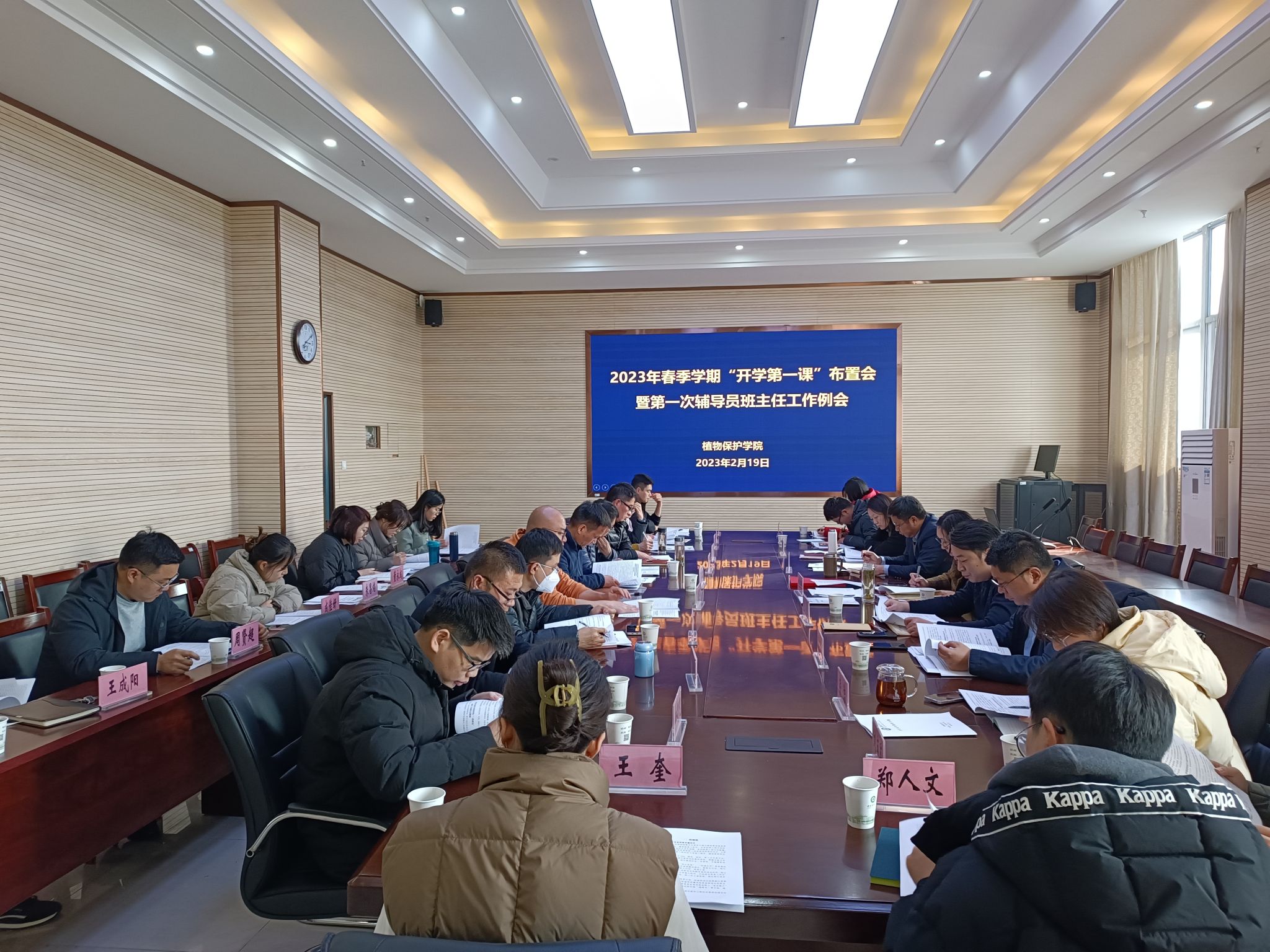 本网讯 2月19日下午,植物保护学院在中西部综合楼1213会议室召开2023年春季学期“开学第一课”布置会暨第一次辅导员班主任工作例会。院党委书记刘柳、常务副院长潘月敏、副院长唐庆峰、张华建出席会议。全体专兼职辅导员、2020级和2021级班主任参加会议。会议由学院党委副书记、纪委书记、副院长汪小强主持。