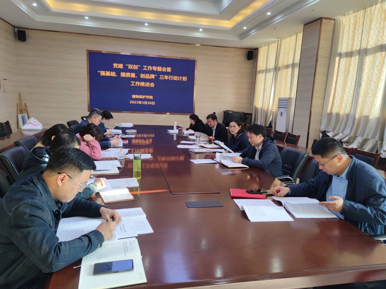 本网讯 3月30日,植物保护学院在中西部综合楼1213会议室召开党建“双创”建设暨“强基础、提质量、创品牌”三年行动计划工作推进会,学院党政领导刘柳、潘月敏、唐庆峰、张华建以及党委委员、各党支部书记、组织员参加会议,会议由学院党委副书记汪小强主持。