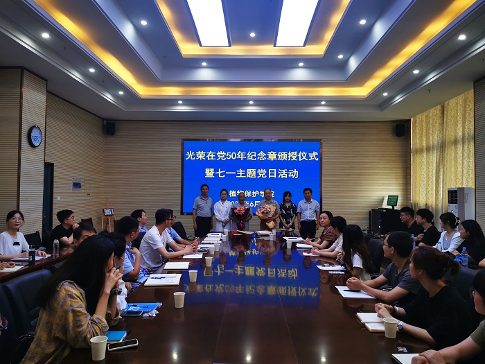 本网讯 6月28日,植物保护学院举办“光荣在党50年”颁授纪念章仪式暨七一主题党日活动,为老党员送上“七一”祝福,共话党的百年光辉历程,畅谈入党初心使命。在党67年、原植保系党总支书记朱以林,在党57年、原农业学院院长吴振廷,学院党政领导,党支部书记、青年教师党员代表及学生党员代表参加会议。活动由学院党委副书记、纪委书记、副院长汪小强主持。
