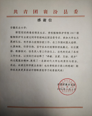 梁志同学是安徽农业大学2017级植物保护学院植物保护专业学生,该生无论在思想上还是行为上都表现十分突出。尤其体现在这次打赢新冠肺炎疫情防控的人民战争中,主动冲锋在前,累计志愿服务时长56天498小时,积极响应基层团组织、团干部的号召,不畏艰险,主动承担责任。