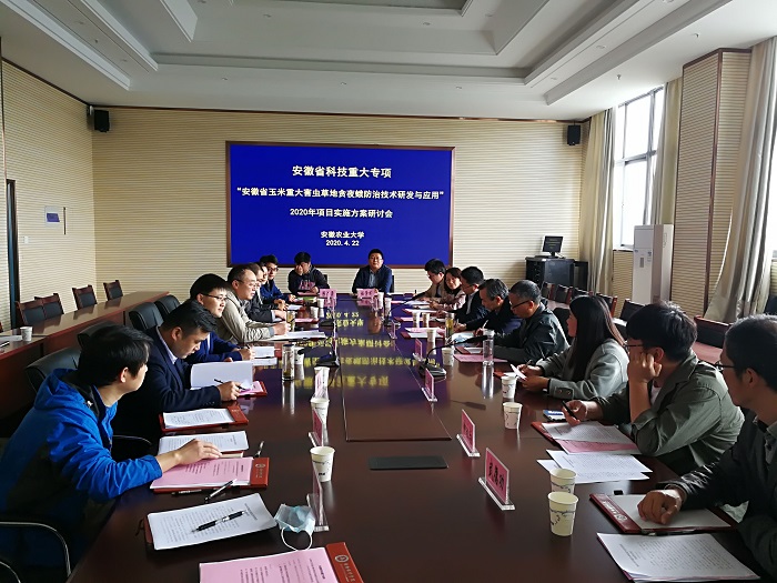 本网讯 4月22日,安徽省科技重大专项“安徽省玉米重大害虫草地贪夜蛾防治技术研发与应用” 2020年项目实施方案研讨会在植物保护学院圆满召开。植保学院副院长周权,安徽省农科院植安所副所长苏卫华研究员,安徽科技学院教研室主任黄保宏教授,安徽省植保总站科长邱坤,项目负责人李桂亭教授,课题负责人及骨干成员参会。会议由李桂亭教授主持。