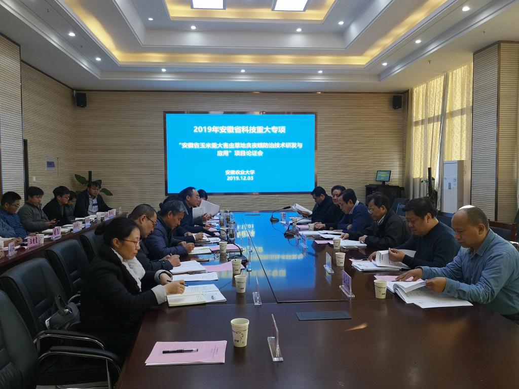 本网讯 12月3日下午,2019年安徽省科技重大专项“安徽省玉米重大害虫草地贪夜蛾防治技术研发与应用”项目论证会在植物保护学院圆满召开。会议邀请了安徽省科技厅农村处副处长韩立生、安徽省农业农村厅种植业局局长张韪研究员、安徽省植保总站曹明坤研究员、合肥工业大学食品与生物工程学院院长徐宝才教授、安徽省农科院绿色食品工程研究所所长阎晓明研究员、合肥师范学院科研处处长王子迎教授等6位专家对项目进行论证。校党委常委、副校长操海群,科技处科长赵冠艳,植保学院党政领导,项目负责人李桂亭教授,课题负责人及骨干成员参会。会议由植保学院副院长周权主持。