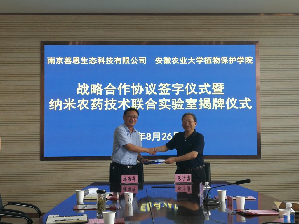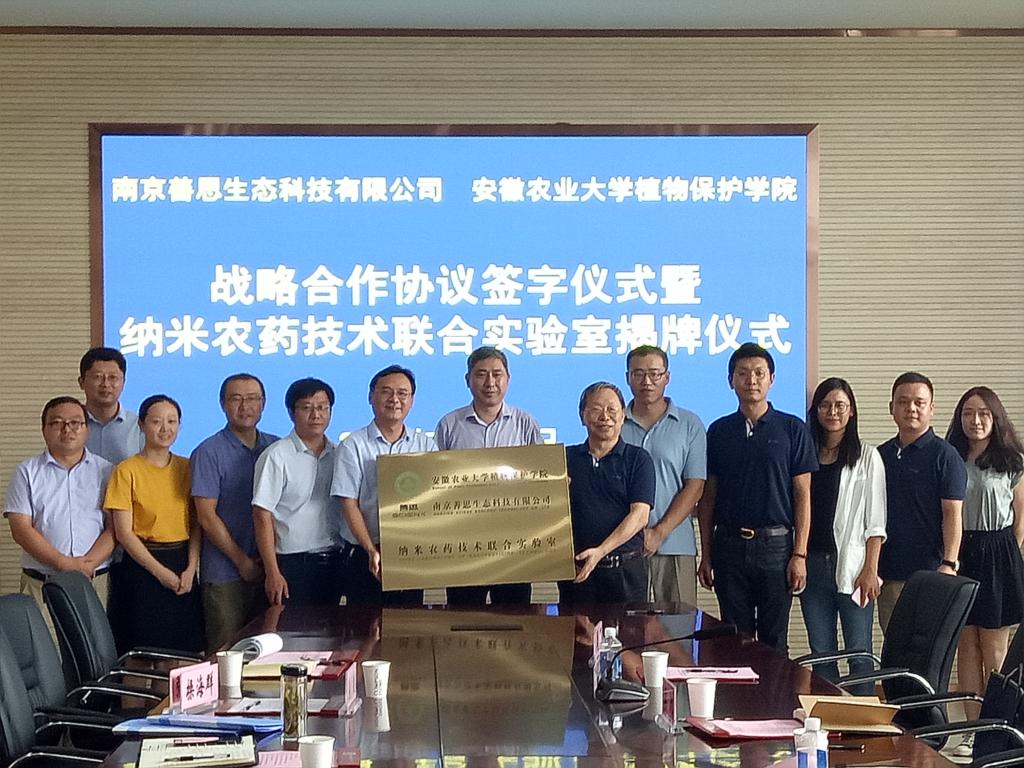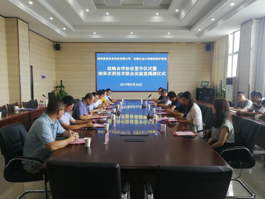 本网讯 8月26日,“安徽农业大学植物保护学院—南京善思生态科技有限公司战略合作协议签字仪式暨纳米农药技术联合实验室揭牌仪式”在植保学院举行。安徽省植保总站站长黄秋云,善思公司纳米科学研究院院长张子勇,首席执行官梁冰,研发中心总监、副院长胡珍娣,人力资源中心总监周围,人事专员郭宁宁,植保学院院长操海群,副院长潘月敏、周权,各系主任,教职工代表出席仪式。仪式由周权主持。