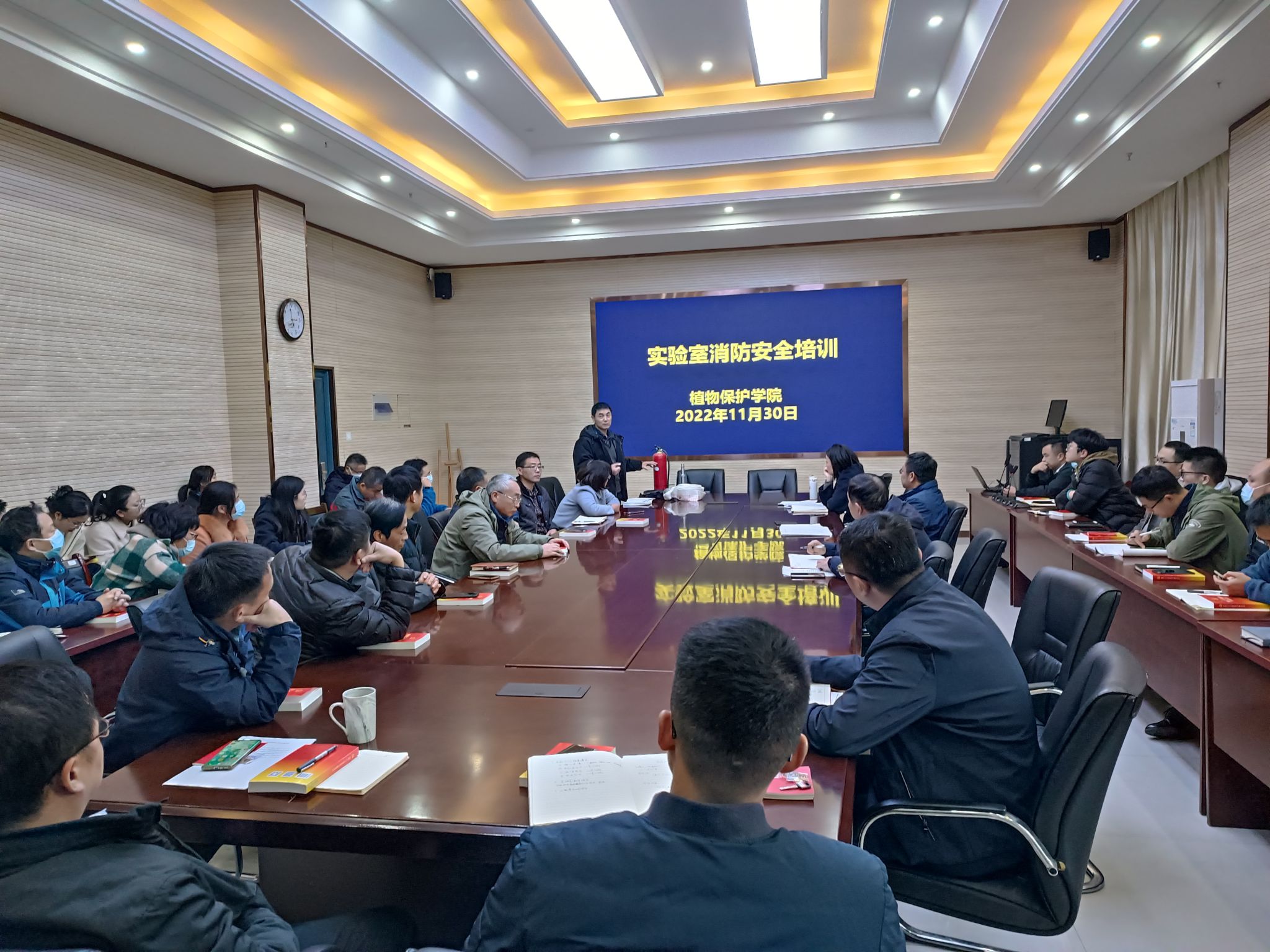会前,校保卫处消防科何宏宝来院开展了实验室消防安全培训,并现场演示了灭火器、消防栓等使用方法和注意事项。(作者:丁放,一审:丁放,二审:汪小强)
