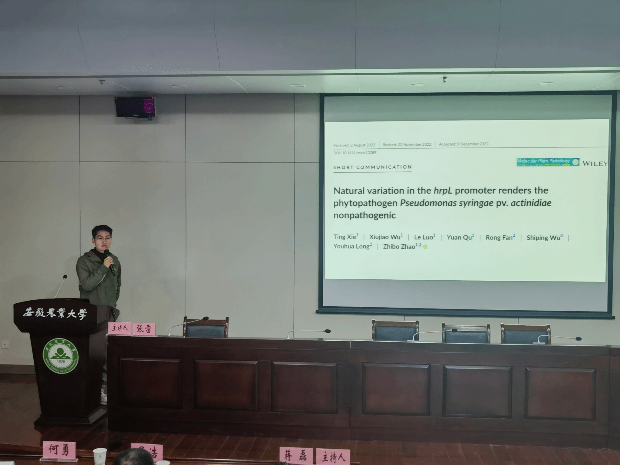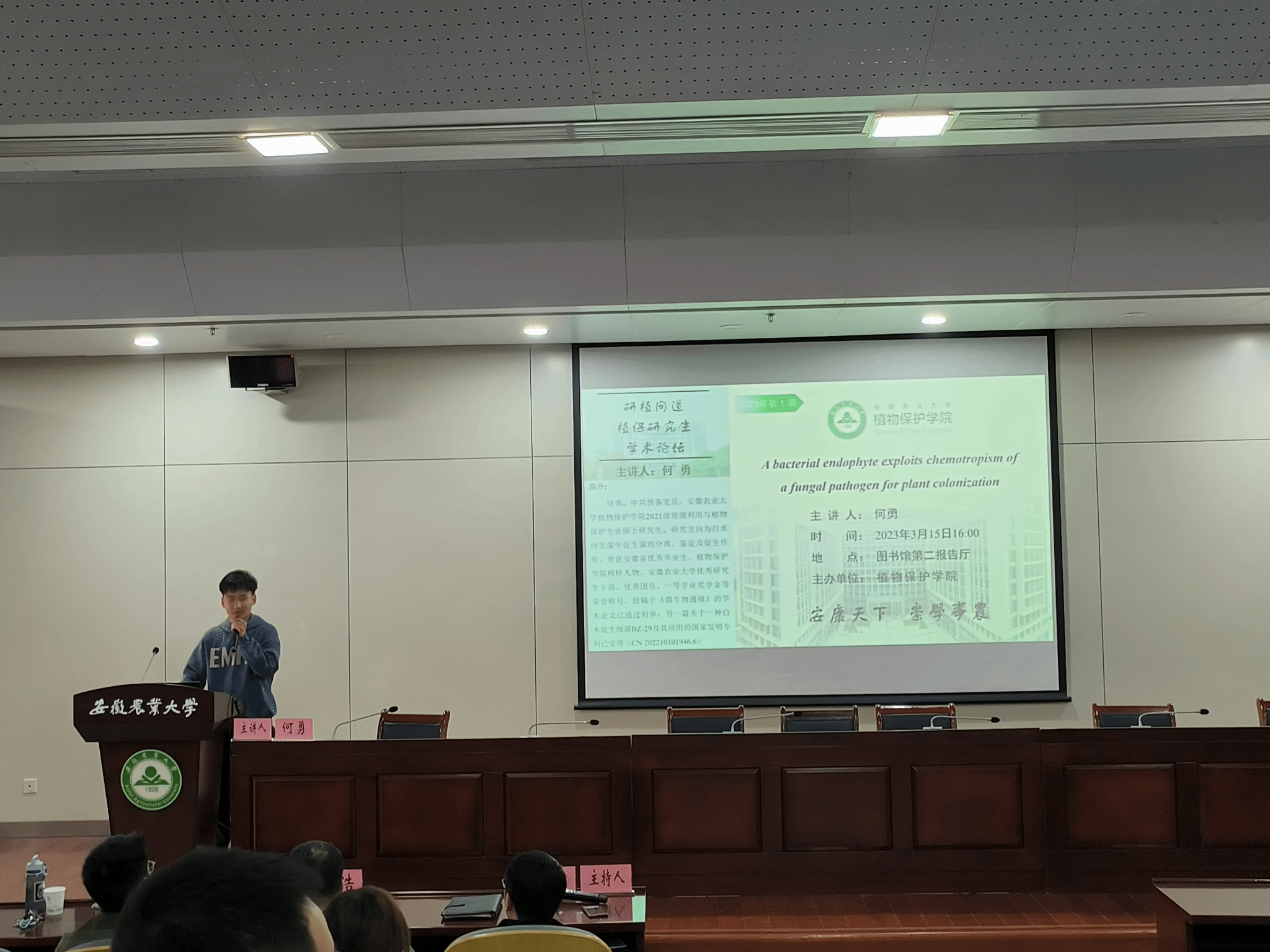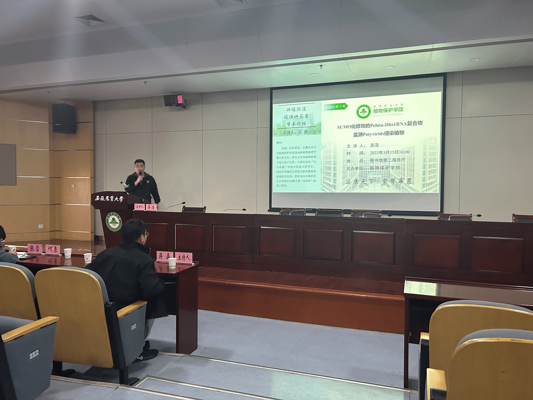 本网讯 为推动研究生群体之间、高层次人才与研究生之间、教师之间的学术交流,激发学生科研热情、提升学生创新能力、营造浓郁的学术氛围、提供互学互鉴的交流平台,3月15日下午,植物保护学院在图书馆第二报告厅举行2023年第一期“研植问道”研究生学术论坛。学院分管研究生教育管理工作副书记汪小强、植物病理学系教师和研究生以及部分本科生参加论坛。论坛由植物病理学系副主任蒋磊主持。