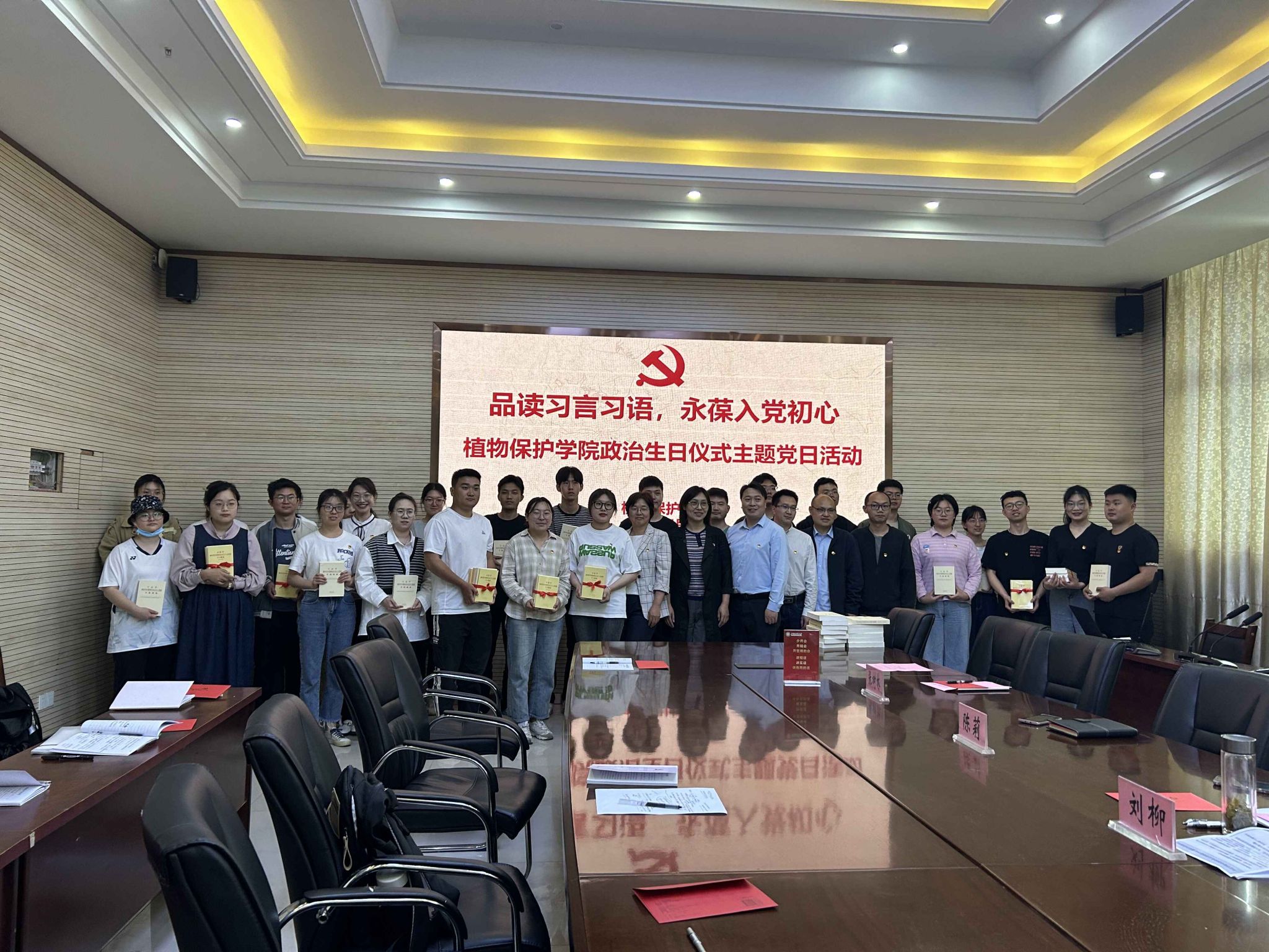本网讯 为营造学习贯彻习近平新时代中国特色社会主义思想主题教育的浓郁氛围,践行习近平总书记对青年的殷切嘱托,加强党性教育筑牢思想之基,创新党员师生“六学”方式,5月4日上午,植物保护学院党委在中西部综合楼1213会议室,以品读“习言习语”、永葆入党初心为主题,开展政治生日仪式主题党日活动。学院党委书记刘柳、学校2022年度师德典型人物陈莉教授等5名党员教师和36名研究生、本科生党员参加会议。会议由院党委副书记、纪委书记、副院长汪小强主持。