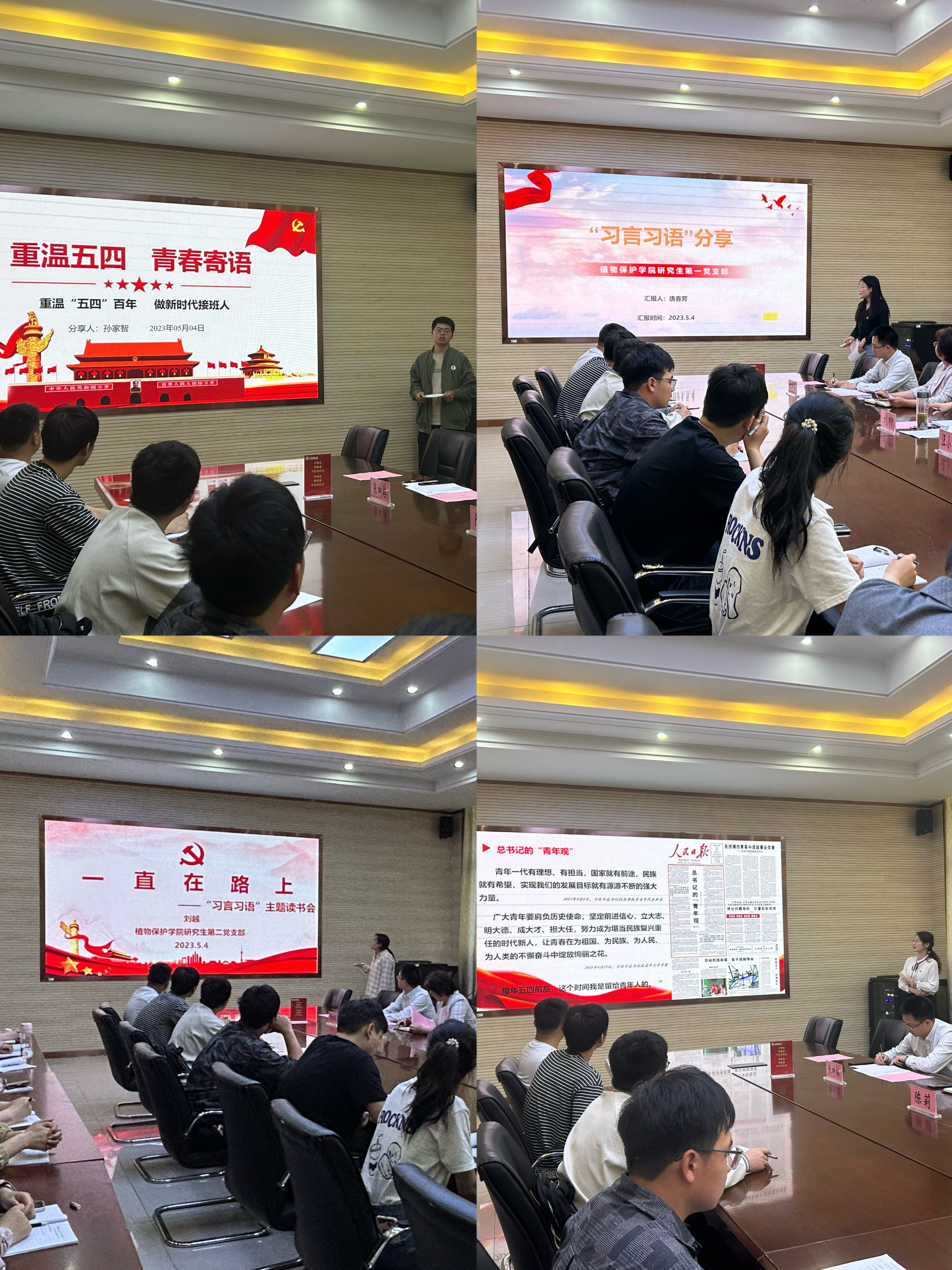 四位党员从自身学习体会,以重温党的十八大以来习近平总书记给青年重要回信精神、学习人民日报重要文章“总书记的‘青年观’”、重温“五四”百年做新时代接班人、从家乡的红色党史中坚定信仰等为题进行了精彩的分享。