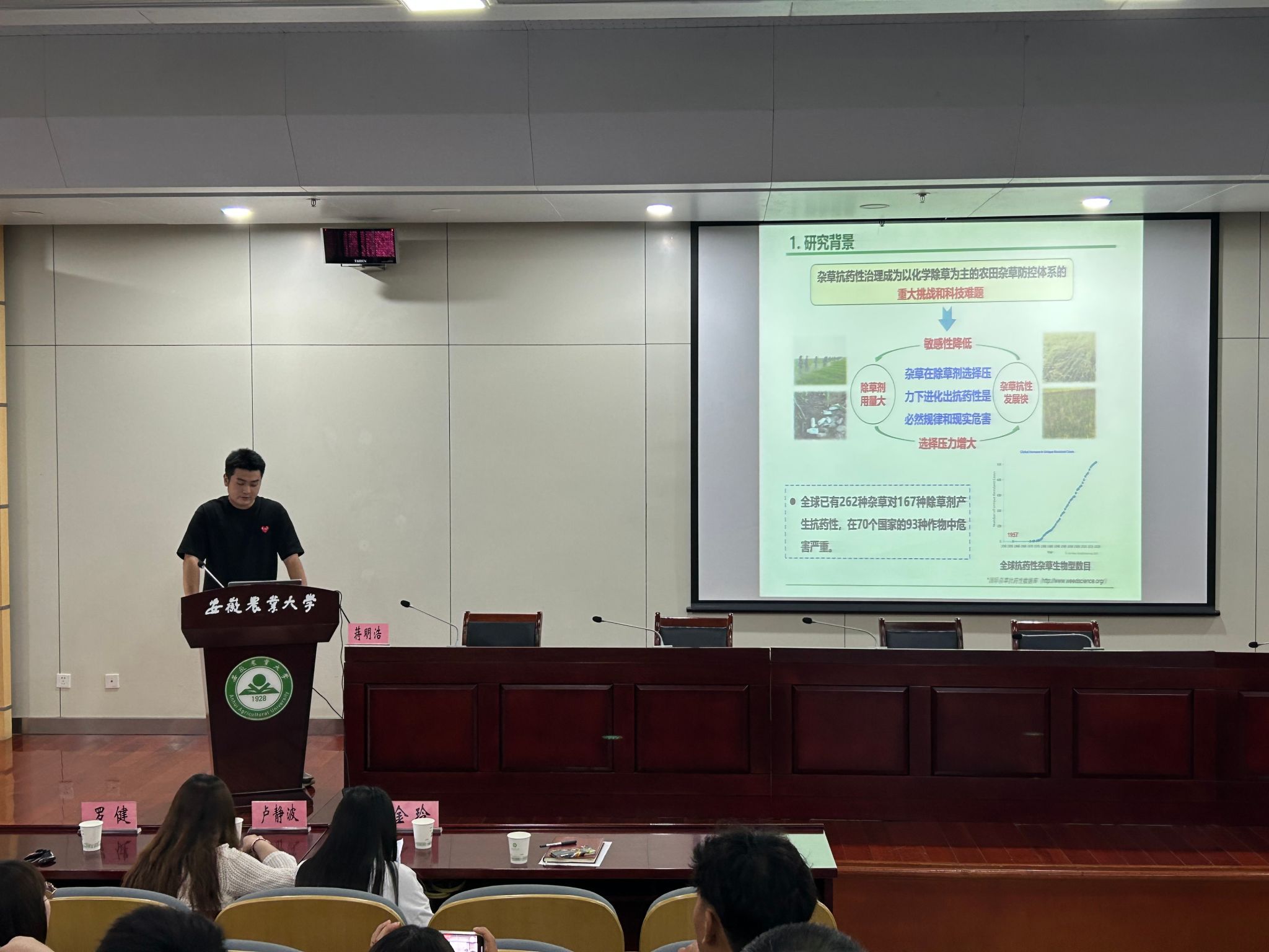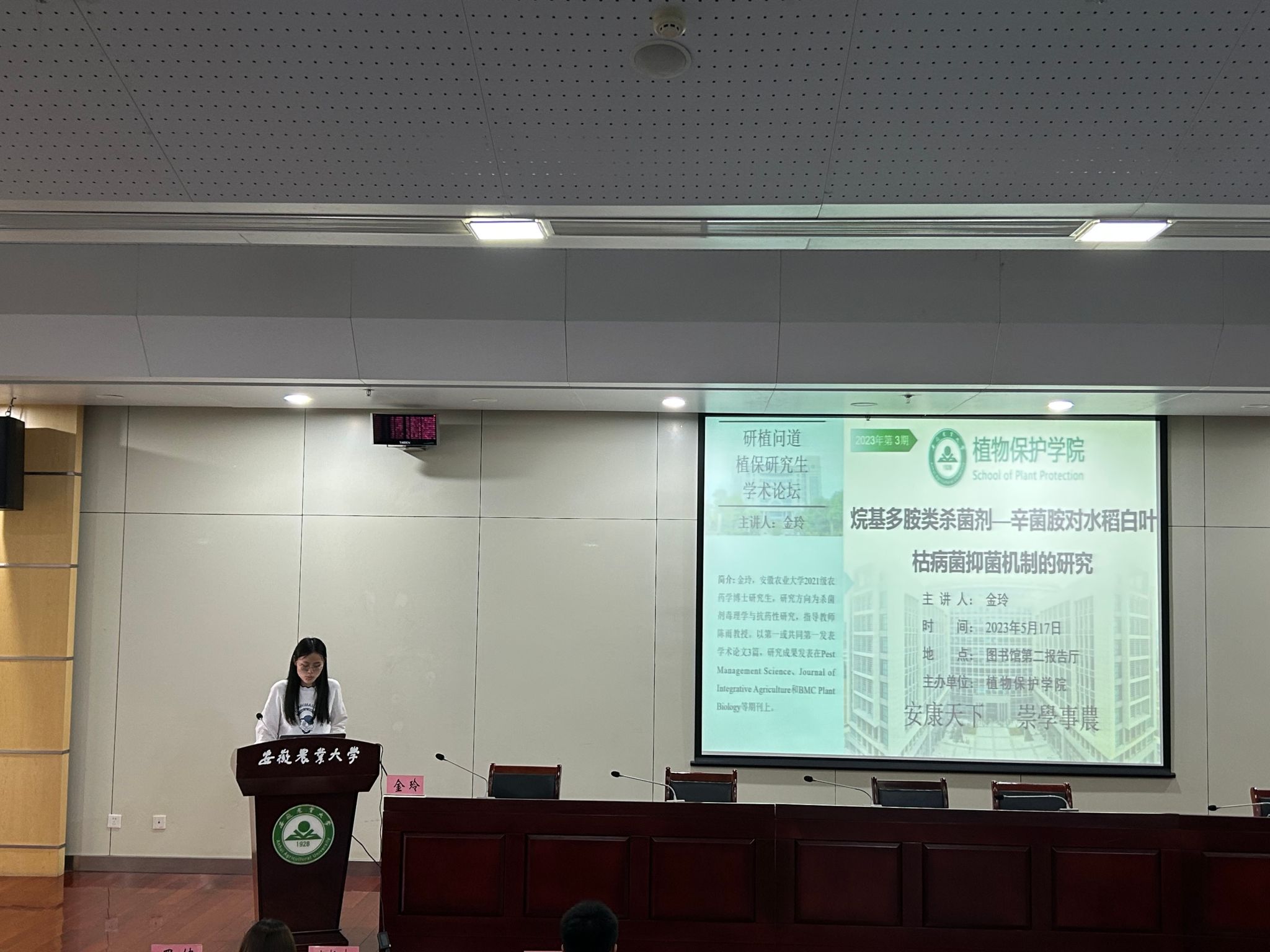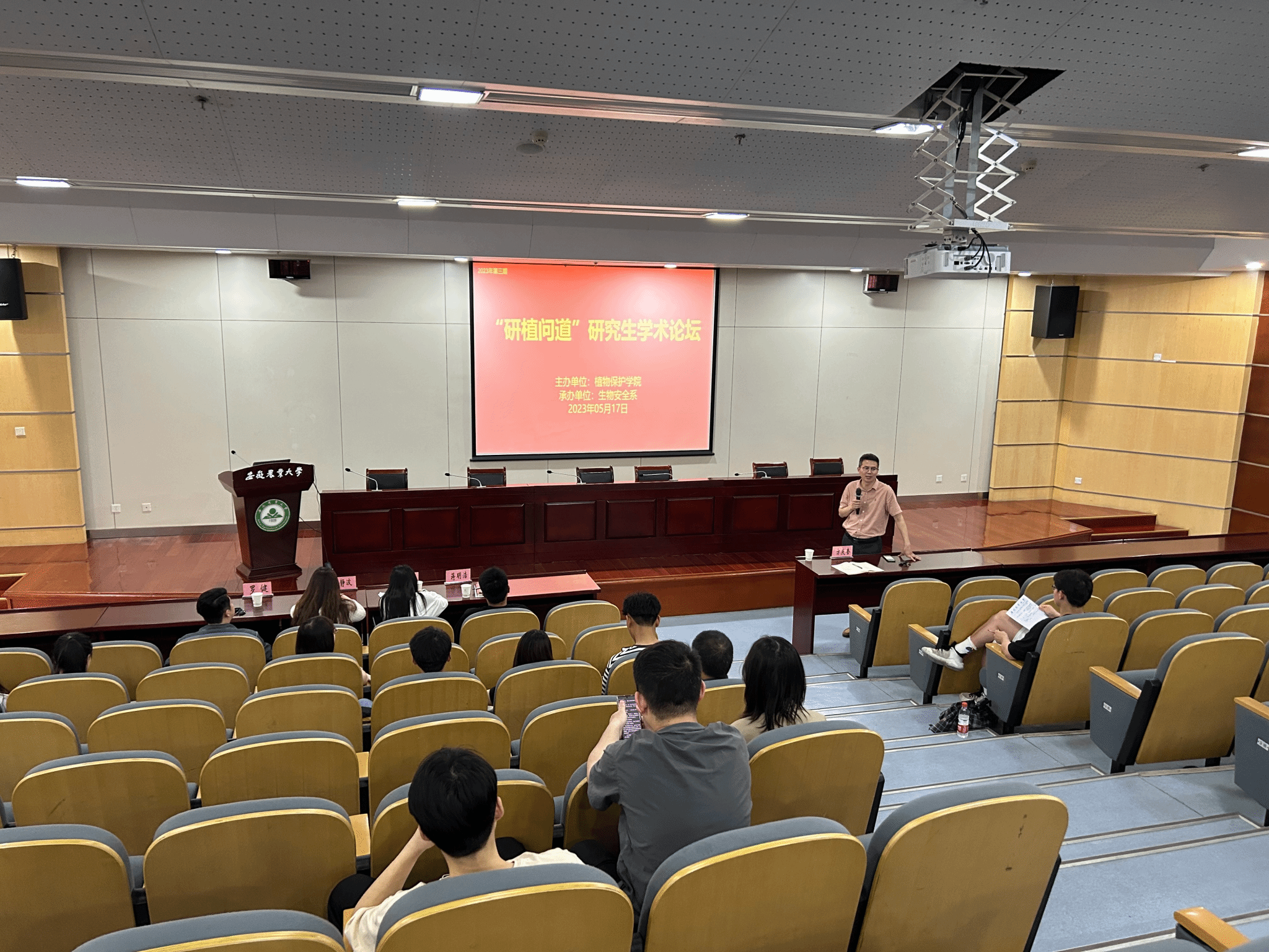 为深入学习贯彻习近平新时代中国特色社会主义思想,引导研究生厚植爱农情怀,练就兴农本领,提高研究生的科研素质,营造浓厚的学术交流氛围,着力培养农业高层次人才,服务农业农村现代化建设。5月17日下午,植物保护学院在图书馆第二报告厅举行2023年第三期“研植问道”研究生学术论坛暨“先锋闪‘药’”论坛。学院分管研究生教育管理工作副书记汪小强、生物安全系教师和研究生以及部分本科生参加论坛。论坛由生物安全系主任、教工第三党支部书记方庆奎主持。