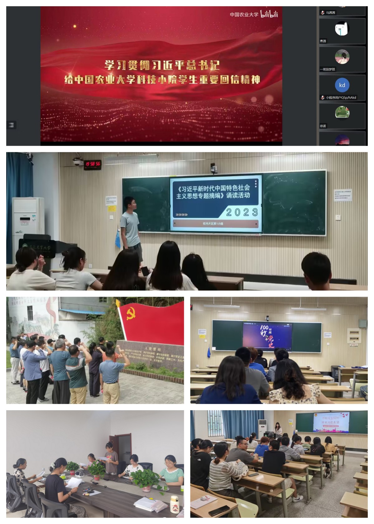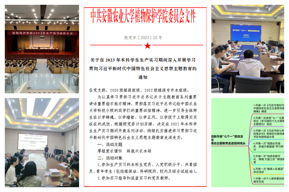 以党员师生为骨干,以入党积极分子为主体,党支部带领团支部,辐射全体团员青年和青年学生,开展“七个一”系列活动,即开展一次《习近平新时代中国特色社会主义思想专题摘编》诵读、一次庆祝“七一”主题党日(学习团的十九大精神主题团日)活动、一次《习近平的七年知青岁月》等新时代新经典书目专题阅读分享、一次“强国必先强农、农强方能国强”学习研讨、一次“传承农耕文化、厚植‘大国三农’”耕读教育、一次“植保人在基层”采访活动、一次个人修养要则的撰写交流,引导全体师生在实习实践中锤炼品德与本领,努力为加快推进农业农村现代化、全面建设社会主义现代化国家贡献青春力量。