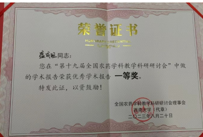 喜讯!我院青年教师盛成旺在“2023年全国农药学科教学科研研讨会” 荣获优秀学术报告一等奖 发布时间:2023-08-24 浏览次数: 本网讯 2023年8月18日-21日,由全国农药学科教学科研研讨会理事会主办,西南大学承办的“2023年全国农药学科教学科研研讨会” 在重庆市召开,我院青年教师盛成旺副教授参会,并做“《农药营销与管理学》线上线下混合式教学模式的课程建设和教学实践”教学改革项目报告,并获得优秀学术报告一等奖。(一审:丁放 二审:刘柳)