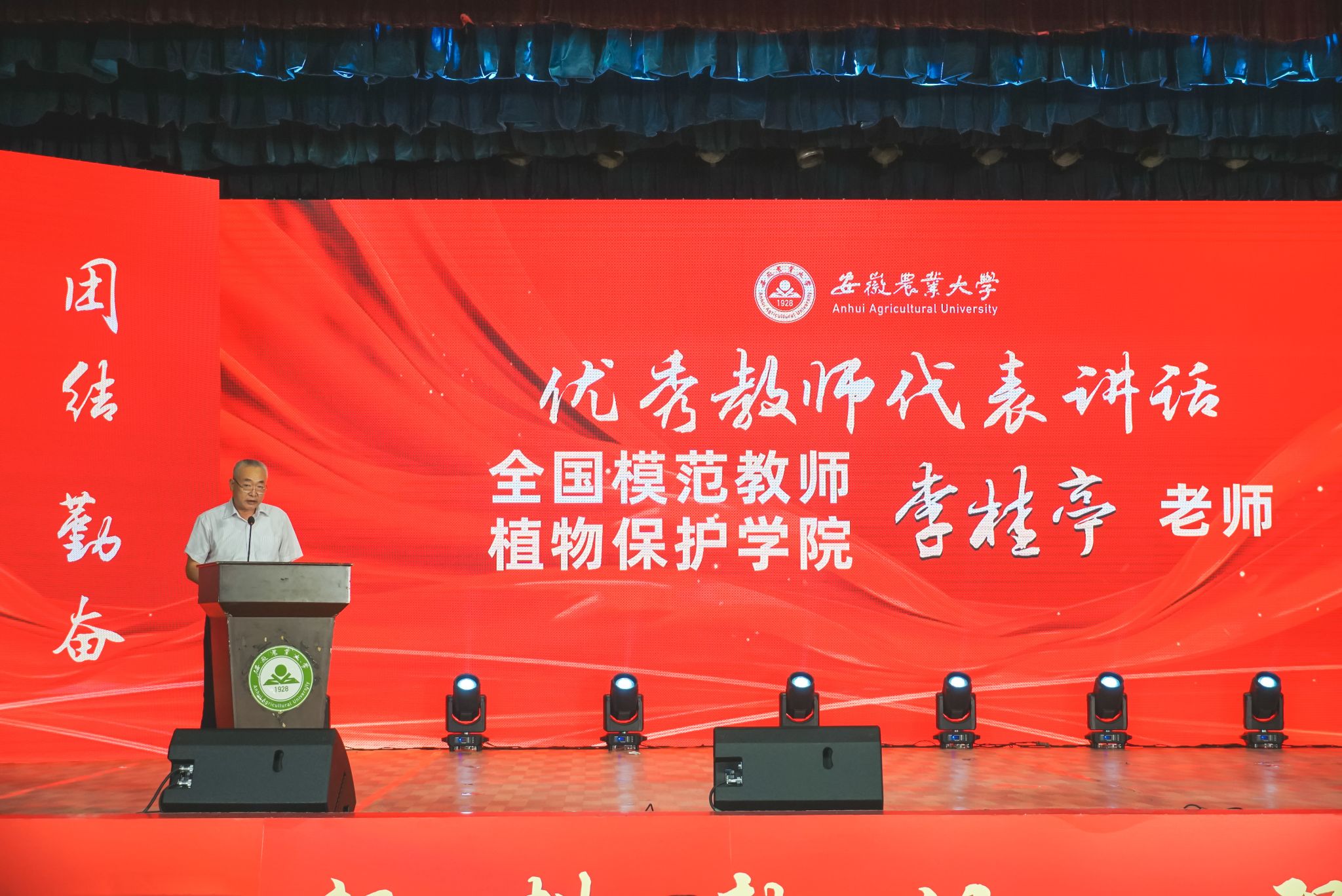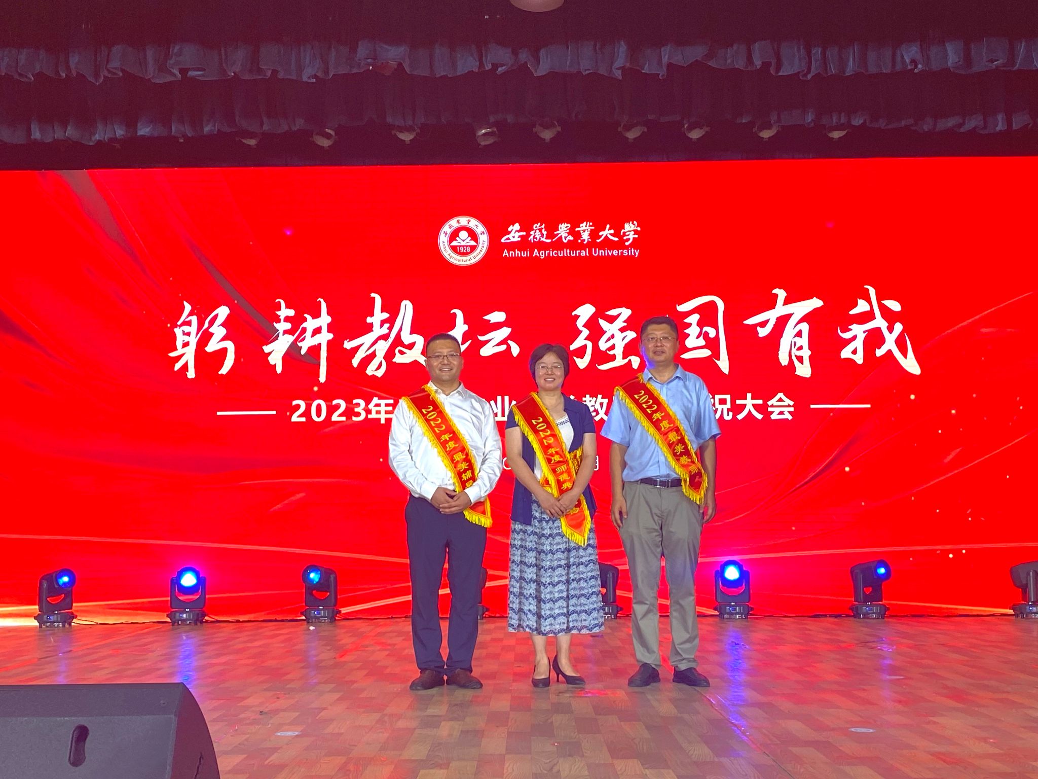 我院三位教师在学校教师节庆祝大会上受表彰 发布时间:2023-09-08 浏览次数: 本网讯 9月8日,在第39个教师节来临之际,学校在大礼堂举办“躬耕教坛,强国有我”教师节庆祝大会。我院教授、全国模范教师李桂亭老师在大会上作为优秀教师代表发言。我院三位教师作为立德树人先进典型上台接受表彰,其中,陈莉老师荣获2022年校“师德典型人物”荣誉称号,唐庆峰老师荣获2022年校“最美教师”荣誉称号,辅导员丁朝阳老师荣获2022年校“最美辅导员”荣誉称号。(作者:凌洁 一审:丁放 二审:汪小强)