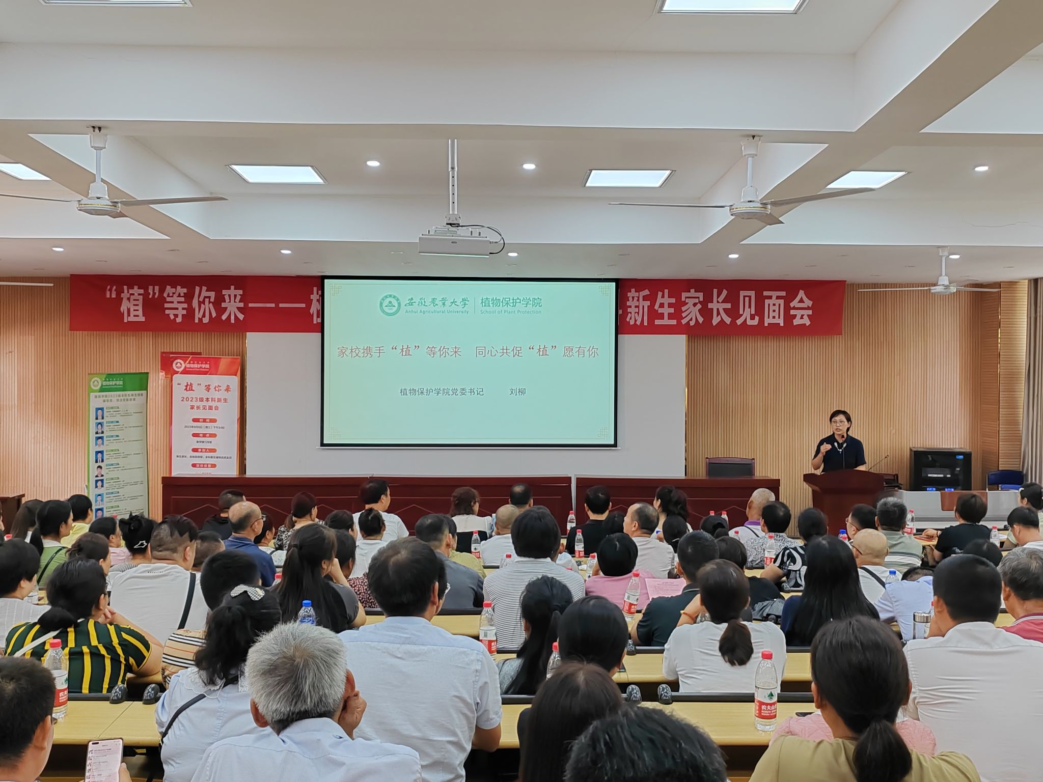 9月10日,植物保护学院在校欣苑食堂四楼小礼堂举办“植”等你来——2023级新生开学典礼。院党委书记刘柳、院长潘月敏、副院长唐庆峰、张华建,2007届校友陈胜利总经理、师德典型人物代表陈莉、党向利,“我最喜爱的老师”——段亚妮、怀宝玉,教师代表郭敏、方庆奎,各班级辅导员、老生代表及近500名本科生和研究生新生参加了开学典礼。会议由副书记汪小强主持。