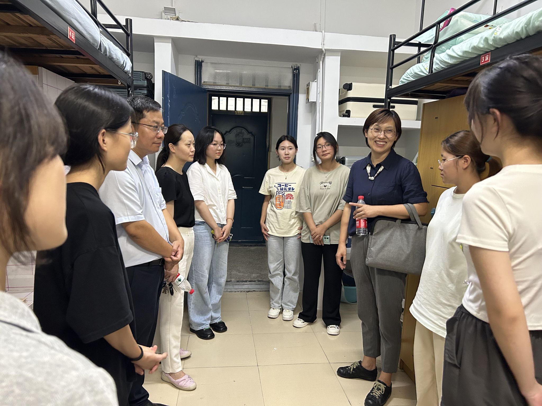 当日下午,学院领导以及辅导员慰问走访新生寝室,与同学们亲切交流,征求生活方面的意见建议,细致并耐心询问新生的相关住宿情况,为他们送去真诚的祝福与关怀。