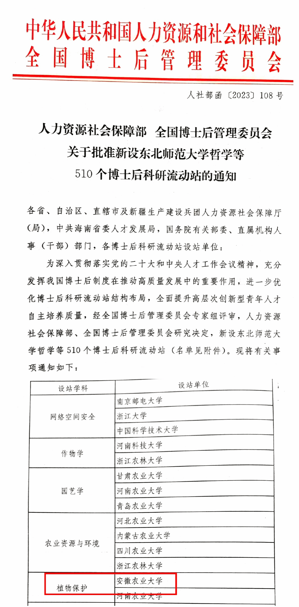 本网讯 近日,人力资源社会保障部、全国博士后管理委员会联合下发了《关于批准新设东北师范大学哲学等510个博士后科研流动站的通知》(人社部函[2023]108号),批准我院新设植物保护博士后流动站,这是我院学科建设取得的又一项新突破。