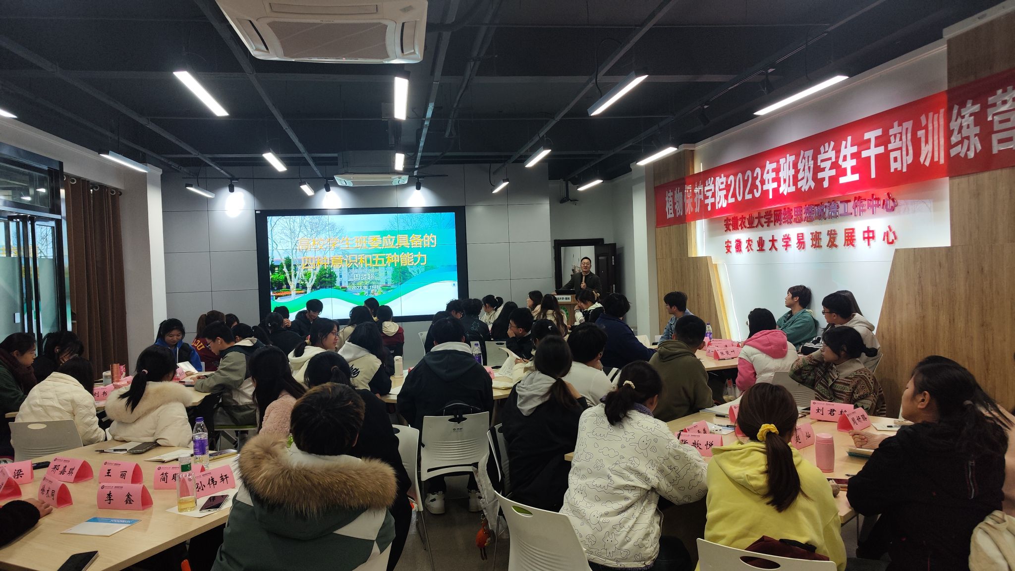 张梦雅老师和裴志远老师就身边的典型人物《榜样力量》和《班级学生干部岗位设置和岗位职责》作了进一步解读和介绍,旨在帮助同学们加强角色转换,清晰角色定位,增强个人履职尽责能力,勉励同学们敢于争先创优,勇于比先进、找差距,通过个人不懈努力,争取为个人、为班级、为学院增光添彩。活动结束后,各班级将在本班中开展训练营,努力发挥传帮带作用,将正能量传递到每位班委中。