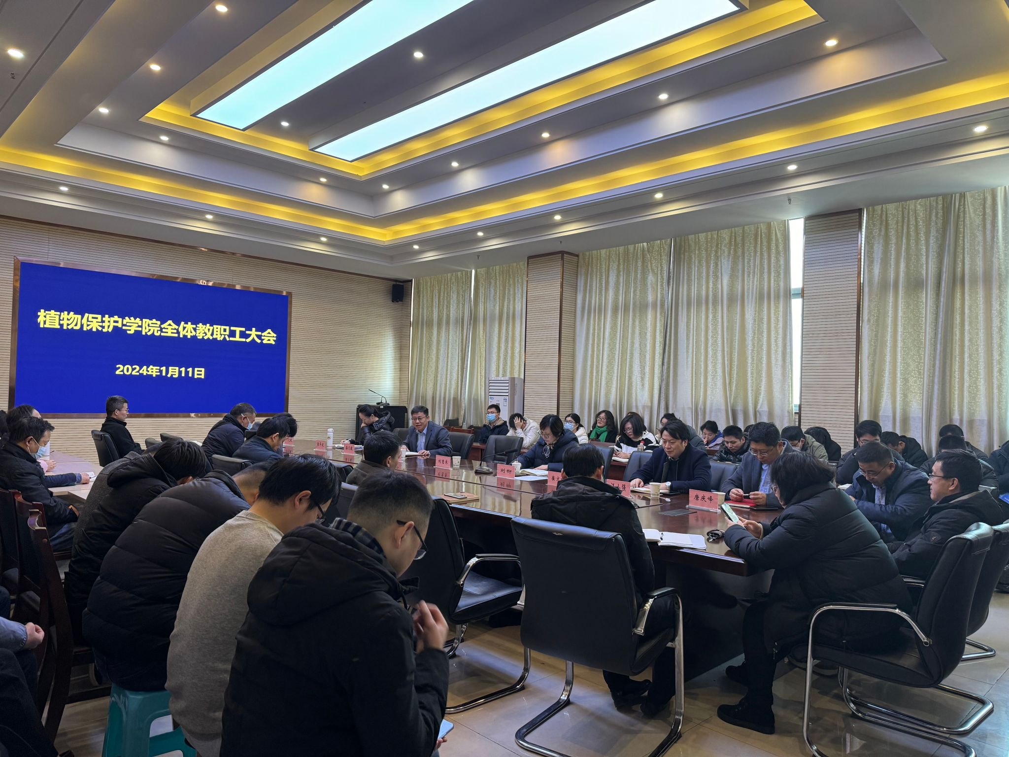 植物保护学院召开全体教职工大会 发布时间:2024-01-11 浏览次数: 本网讯 1月11日,学院召开全体教职工大会。会议通报了2023年度工作成效,对全体教师一年来的辛勤工作表示感谢;对2024年重点工作作了部署,对寒假期间年终考核绩效核定、国家基金打磨、管理人员搬迁、实验室安全管理、学生安全教育等系列工作作了安排。文图/蒋秋双 编辑/丁放 预审/汪小强 )