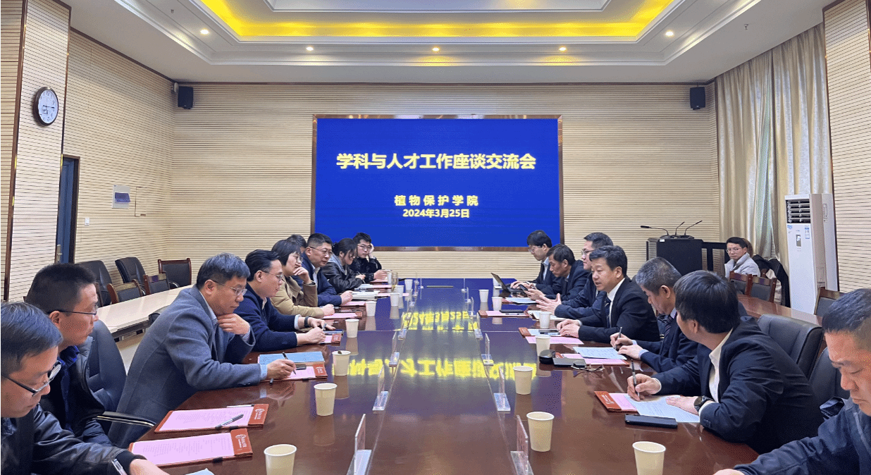 本网讯 3月25日下午,植物保护学院学科与人才工作座谈交流会在中西部大楼1213会议室举行。中国农业科学院草原研究所所长林克剑、植物保护研究所副所长张杰、草原研究所科研处处长李元恒,CABI东亚与东南亚中心主任张峰,山东省农业科学院植物保护研究所党委书记、所长翟一凡,安徽省植保总站副站长黄超和安徽久易农业股份有限公司董事长沈运河受邀出席座谈会。我校党委常委、副校长操海群,植物保护学院党政领导、系主任、教授和青年教师代表参加会议,会议由学院院长潘月敏主持。
