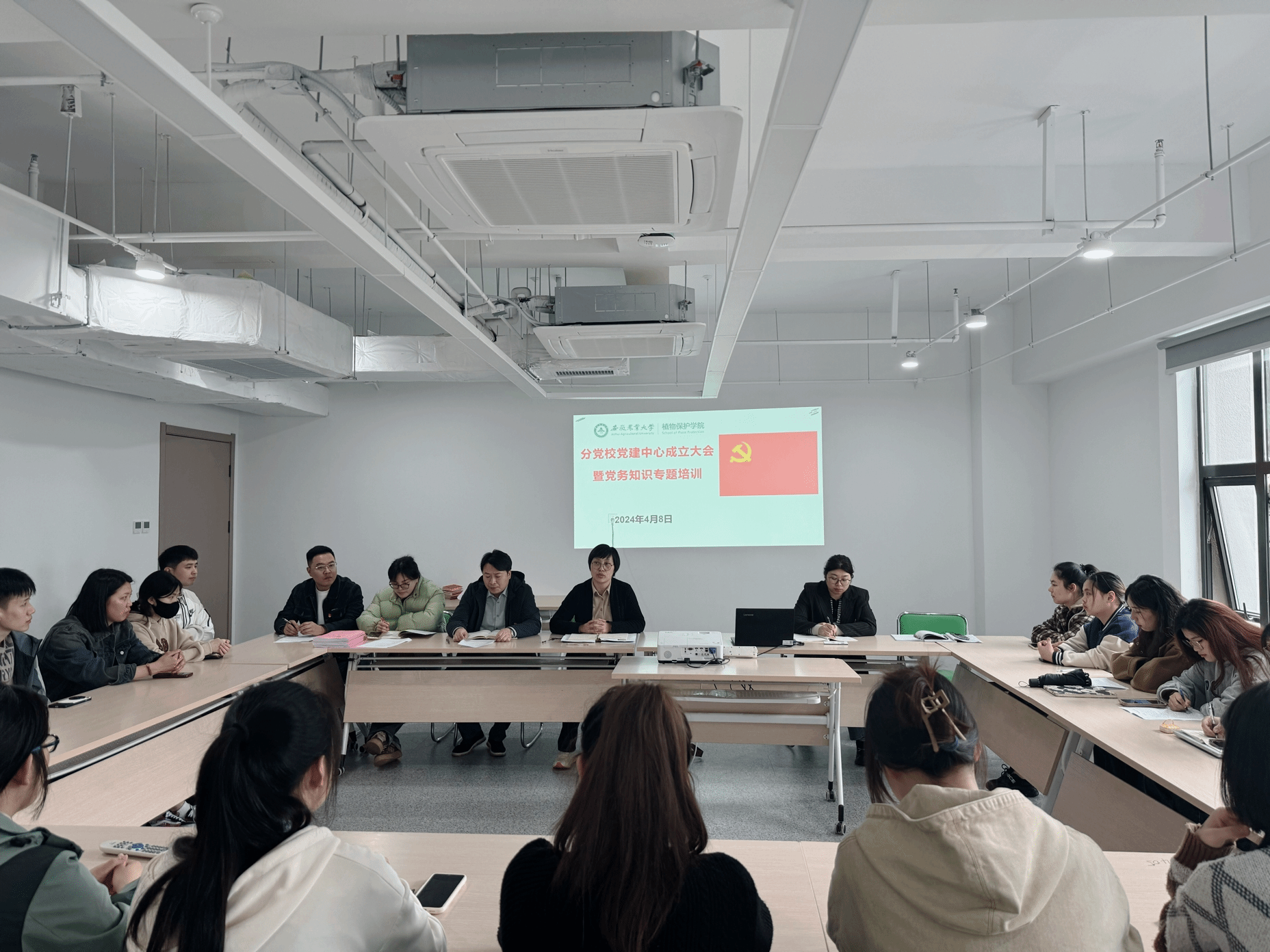 本网讯 为巩固深化学习贯彻习近平新时代中国特色社会主义思想主题教育成果,贯彻落实习近平总书记关于党的建设的重要思想特别是高校党建和思想政治工作的重要指示精神,健全党员发展全过程管理育人链条,打造“党建+学生工作室”组织育人平台。4月8日,植物保护学院在勤业楼1406室召开分党校党建中心成立大会暨党务知识专题培训会。院党委书记刘柳、各学生支部书记和支部委员、党建中心全体成员参加会议,会议由院党委副书记汪小强主持。