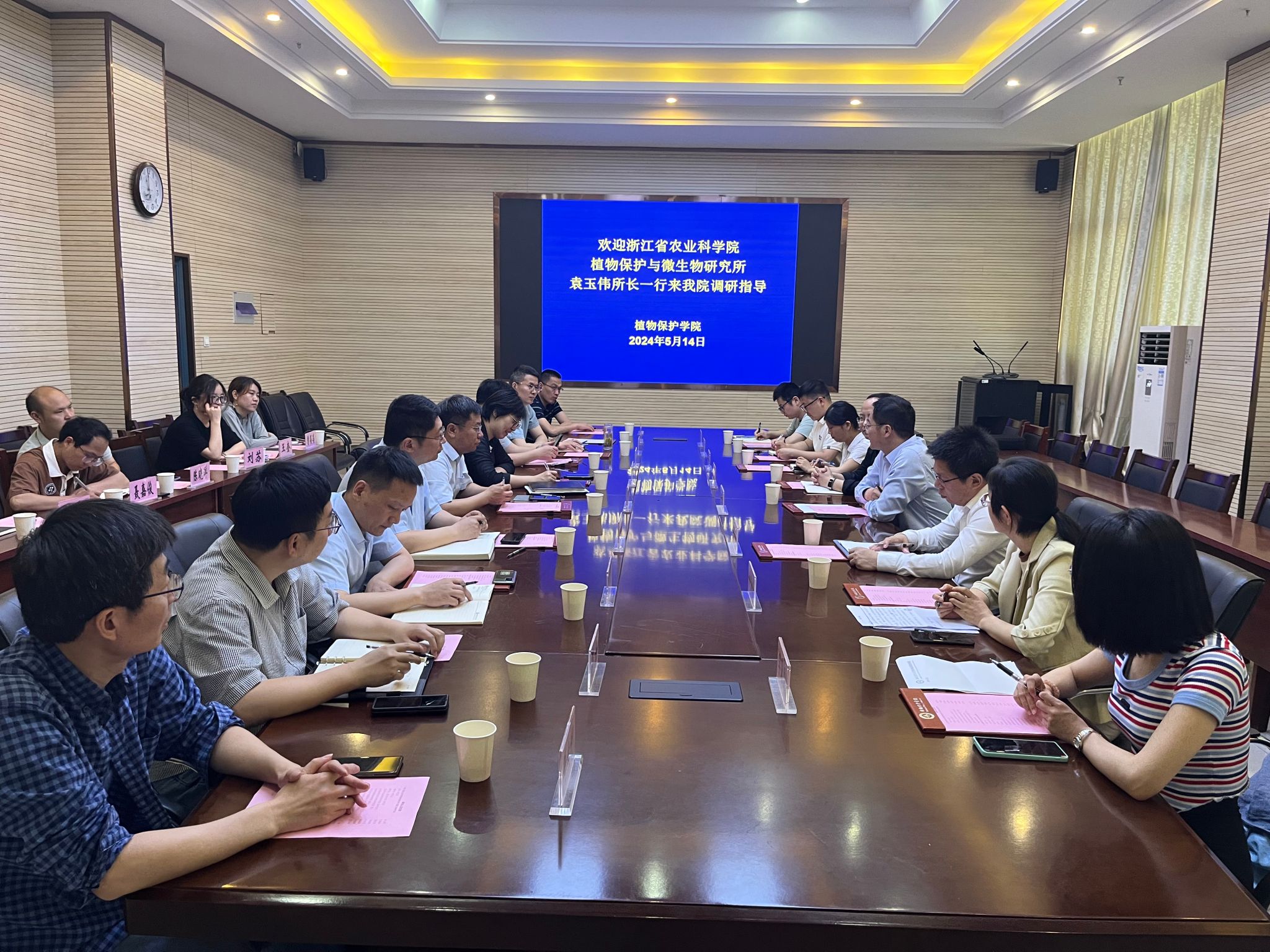 浙江省农业科学院植物保护与微生物研究所来我院调研 发布时间:2024-05-16 浏览次数: 本网讯 5月14日,浙江省农业科学院植物保护与微生物研究所袁玉伟所长一行来我院调研,学院党政领导、系主任、教授和青年教师代表参加会议,会议由学院院长潘月敏主持。座谈会上,双方就持续深化合作,共寻发展机遇,实现优势互补等方面进行深入交流。会议强调,双方要进一步相互联系、促进经验交流、探索合作渠道,在高水平平台打造、高质量科研成果产出、高品质社会服务成果转化等方面互相借鉴、取长补短、齐心协力,进一步实现双方携手发展。(文图/刘莉 编辑/丁放 预审/汪小强 审核/刘柳)