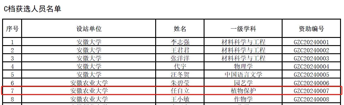 本网讯 近日,全国博士后管委会办公室、中国博士后科学基金会公布了2024年度国家资助博士后研究人员计划(B档、C档)获选人员名单,我院植物保护博士后流动站1人成果获得C档资助。项目负责人为在站博士后任自立,合作导师为操海群教授。
