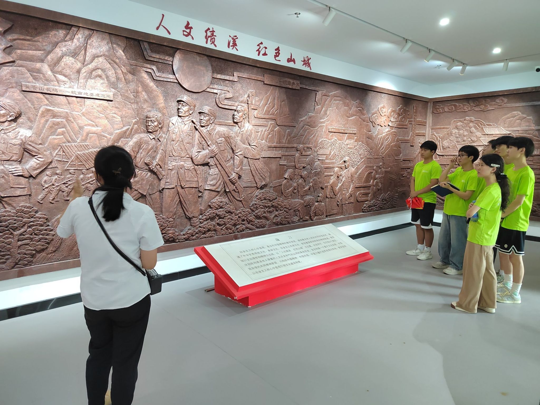 循着挂满古代圣贤的楼梯,团队一行人来到了党校主题教育馆。入目,便是仿古铜浮雕墙,绘制着绩溪代表地点。馆内分为序厅、引厅和2个展区,分别陈列绩溪悠久厚重的人文历史和气壮山河的革命历史,助力构建一个基于文化自信、价值观自信的共同精神家园。馆内不仅有相关图文介绍,更有以玻璃专柜陈列的藏品——徽派木雕、国画作品等。