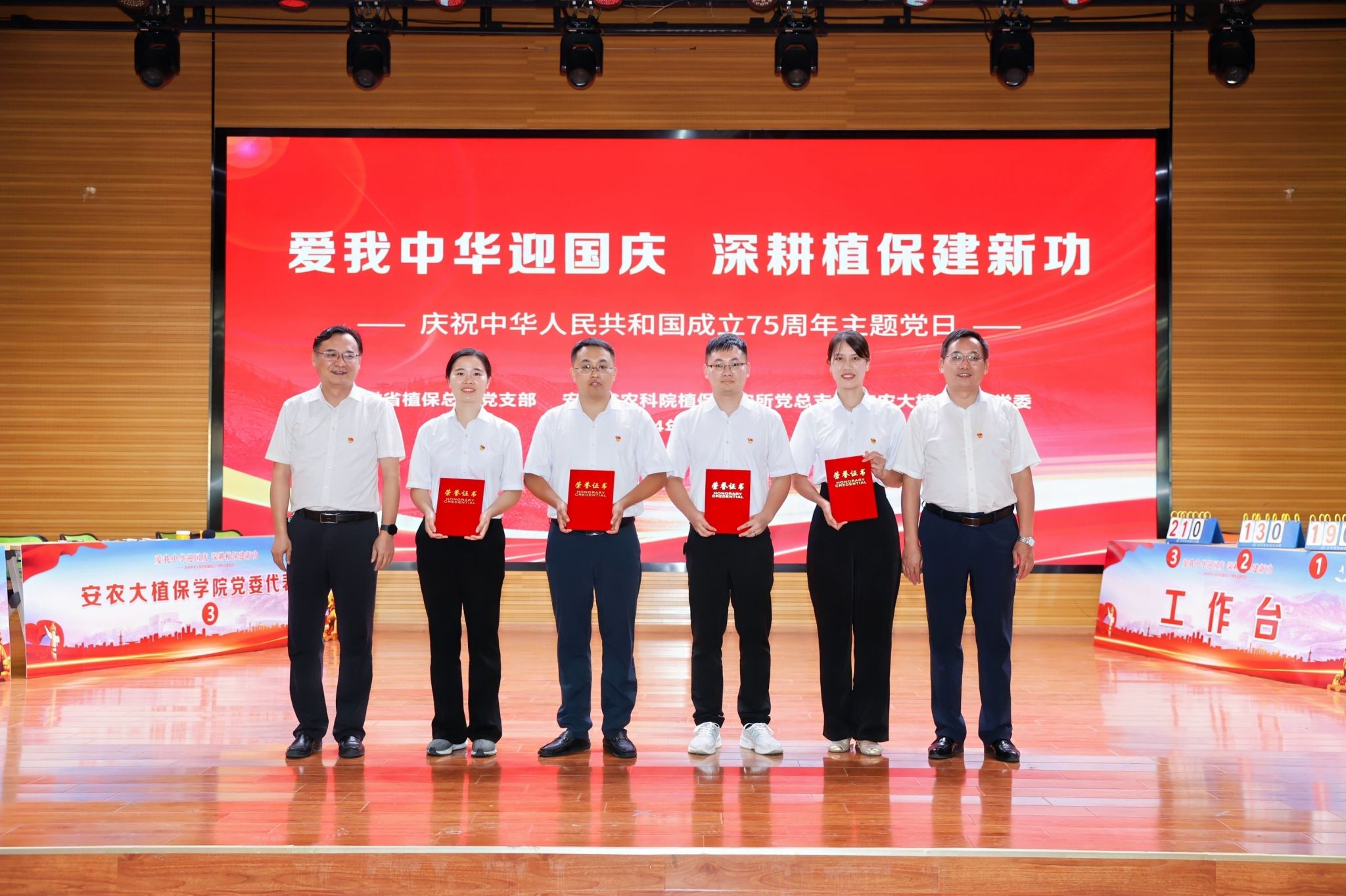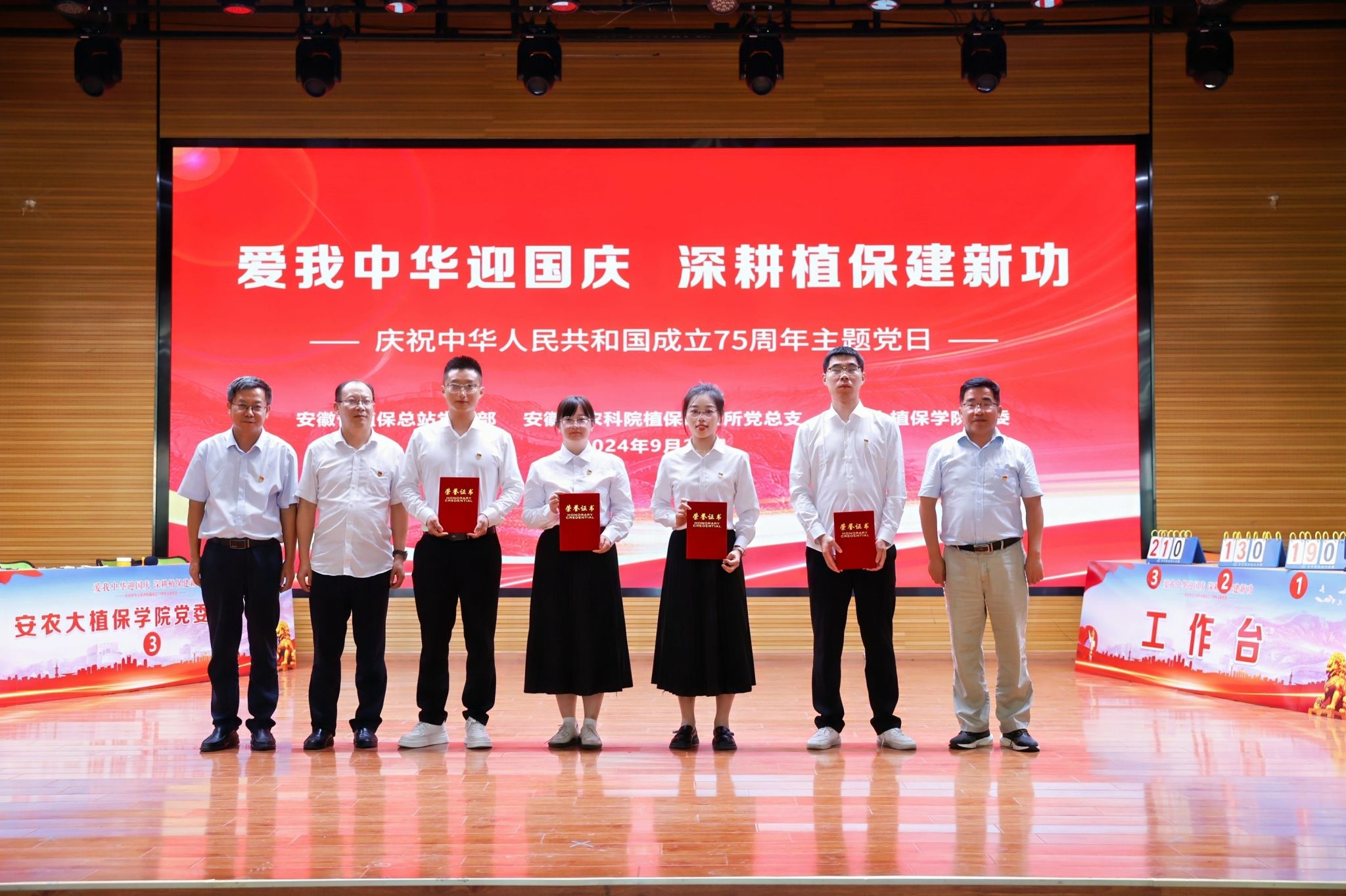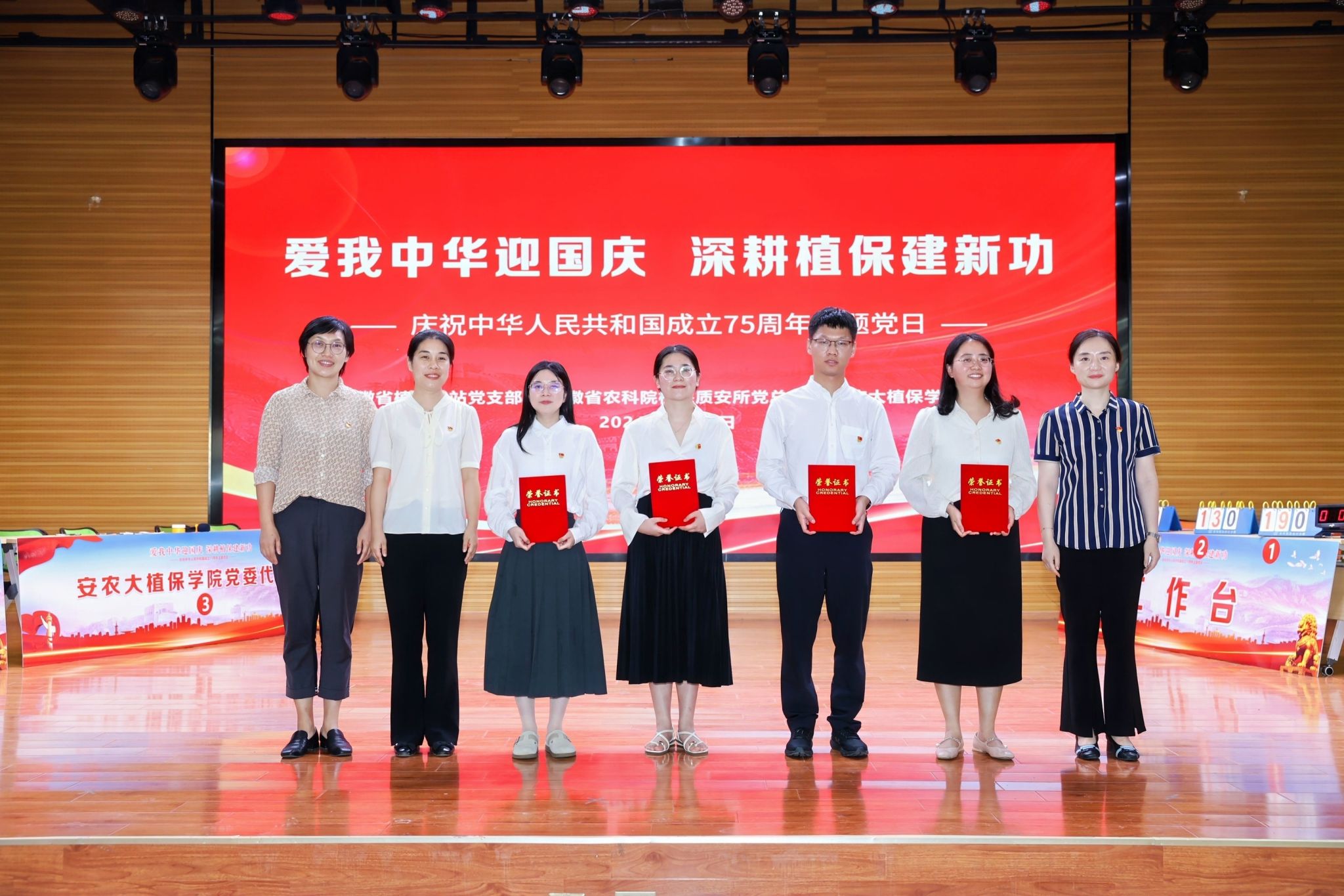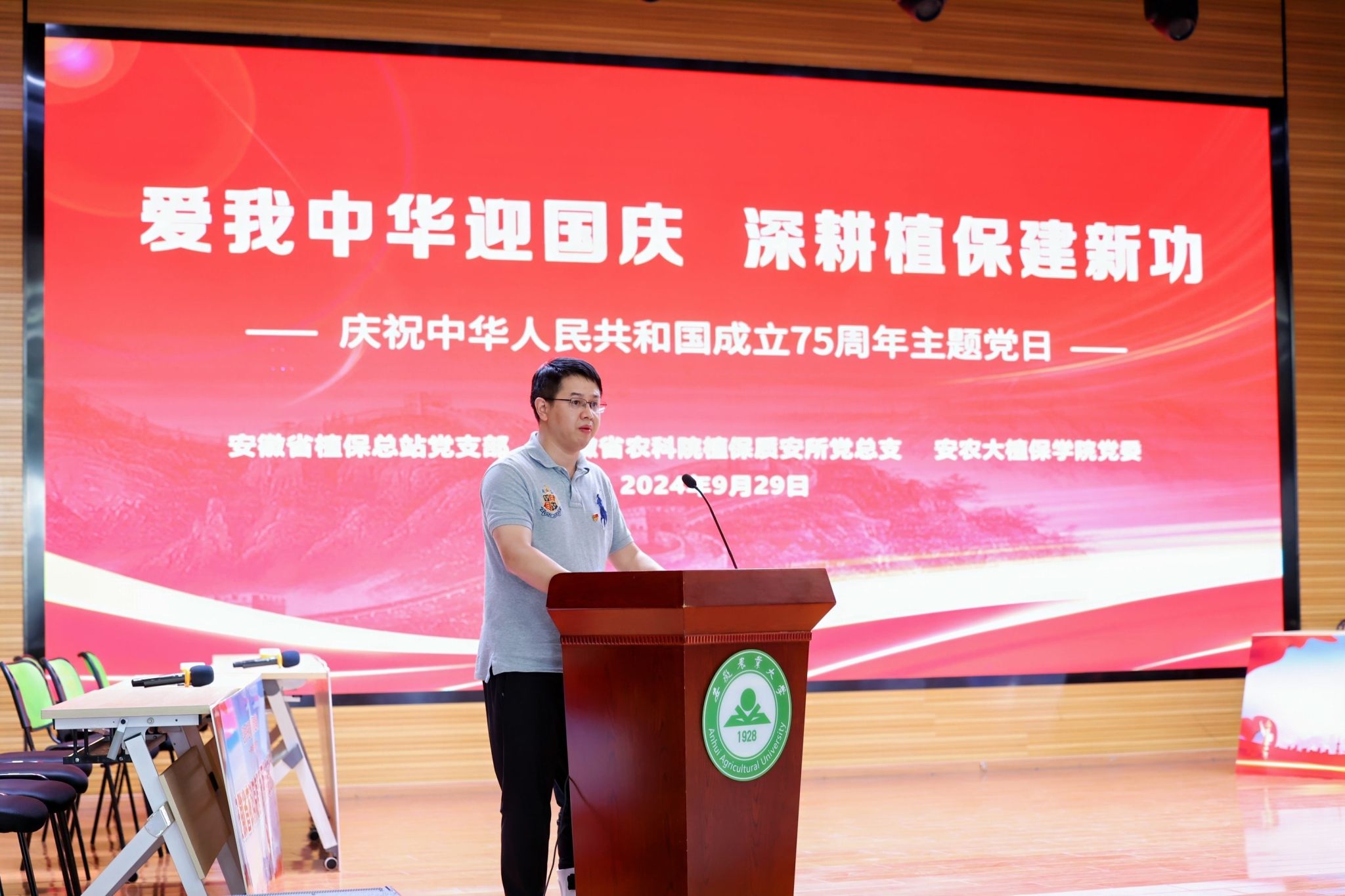 本网讯 9月29日下午,安徽省植保总站党支部、安徽省农科院植保质安所党总支、安农大植保学院党委在欣苑四楼小礼堂联合组织开展“爱我中华迎国庆 深耕植保建新功”庆祝中华人民共和国成立75周年主题党日暨知识竞赛活动。校党委常委、副校长操海群出席活动并为获奖代表队颁奖。校党委常委、副校长吴祥为、省农业农村厅机关党委副书记、机关纪委书记朱振国出席活动并致辞。三家党组织负责同志以及各参赛队伍、干部员工和师生代表参加活动。