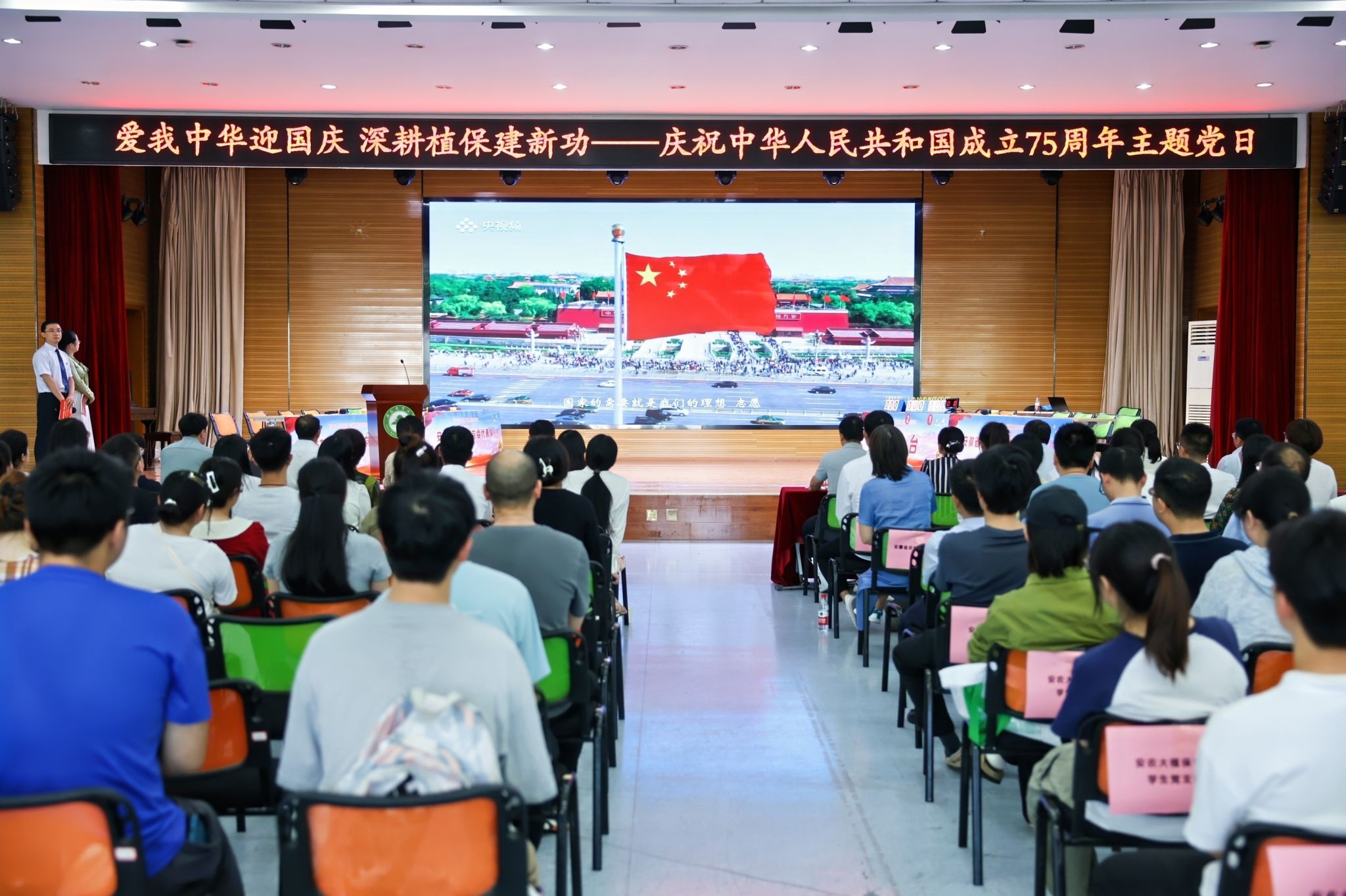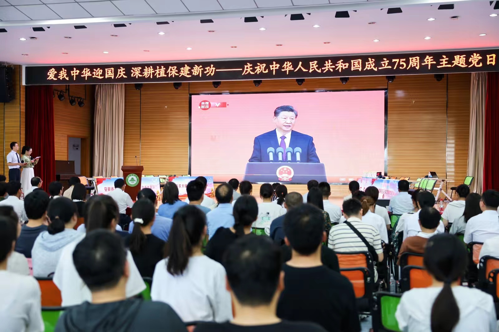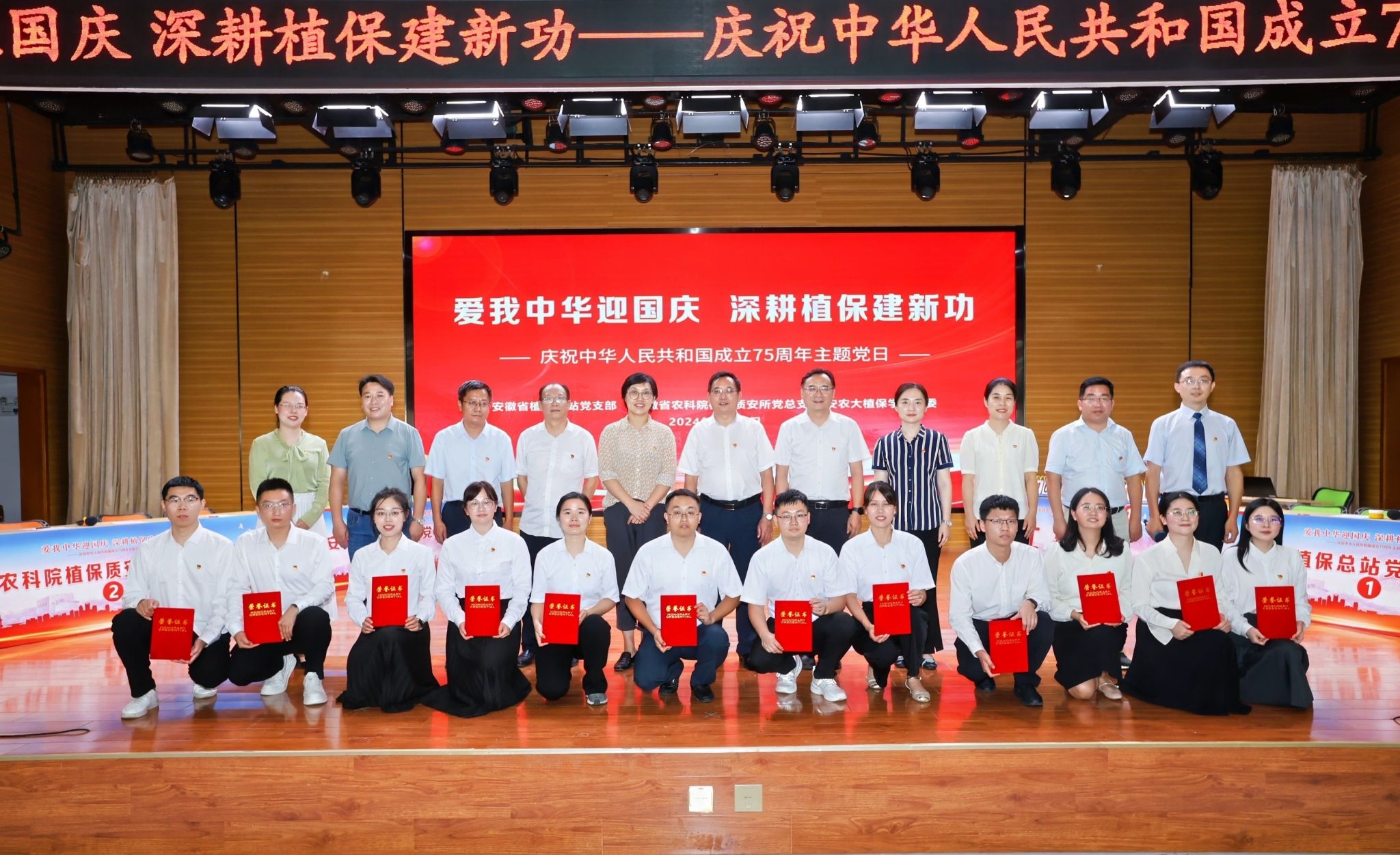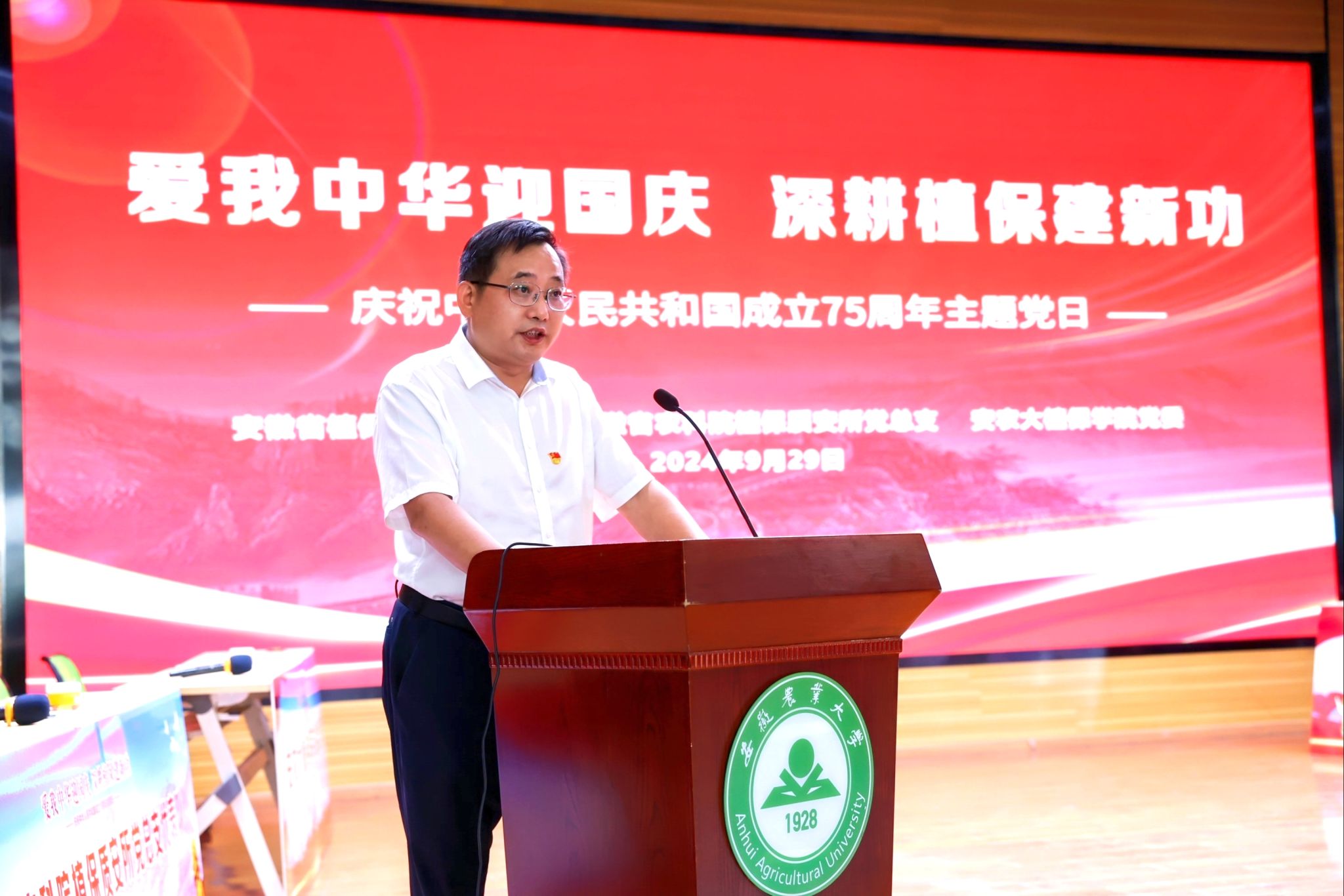 本网讯 9月29日下午,安徽省植保总站党支部、安徽省农科院植保质安所党总支、安农大植保学院党委在欣苑四楼小礼堂联合组织开展“爱我中华迎国庆 深耕植保建新功”庆祝中华人民共和国成立75周年主题党日暨知识竞赛活动。校党委常委、副校长操海群出席活动并为获奖代表队颁奖。校党委常委、副校长吴祥为、省农业农村厅机关党委副书记、机关纪委书记朱振国出席活动并致辞。三家党组织负责同志以及各参赛队伍、干部员工和师生代表参加活动。