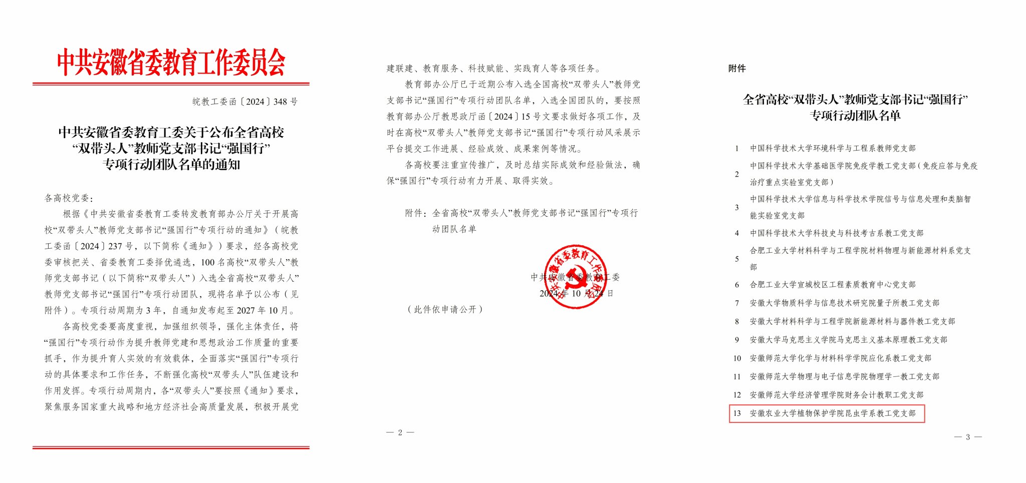 根据《中共安徽省委教育工委转发教育部办公厅关于开展高校“双带头人”教师党支部书记“强国行”专项行动的通知》(皖教工委函〔2024〕237号)要求,经学校党委审核把关、省委教育工委择优遴选,植物保护学院昆虫学系教工党支部成功入选全省高校“双带头人”教师支部书记“强国行”专项行动项目。专项行动周期为3年,自通知发布起至 2027年10月。