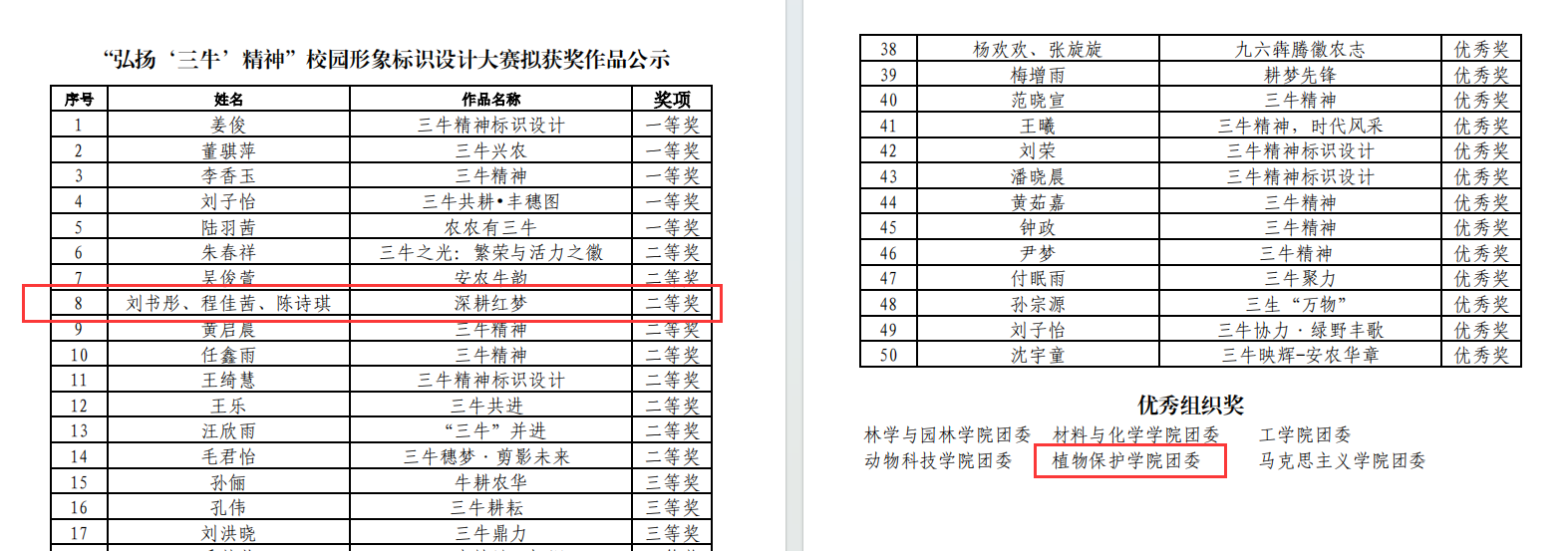 我院在“弘扬‘三牛’精神”校园形象标识设计大赛中获奖优秀组织奖 发布时间:2024-10-29 浏览次数: 本网讯 近日,由共青团安徽农业大学委员会、安徽农业大学校友会主办,共青团林学与园林学院委员会承办的“弘扬‘三牛’精神”校园形象标识设计大赛评选结果公布,我院荣获优秀组织奖。本次大赛以“弘扬‘三牛’精神”为主题,设计“三牛”——孺子牛、拓荒牛、老黄牛的标识形象。前期学院广泛宣传、积极组织学生报名参赛。最终,22植物保护专业刘书彤、程佳茜、陈诗琪等3人的作品《深耕红梦》获得二等奖。(文图/张小龙 编辑/邢文静 预审/汪小强 审核/刘柳)