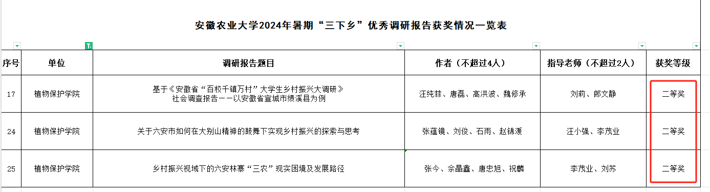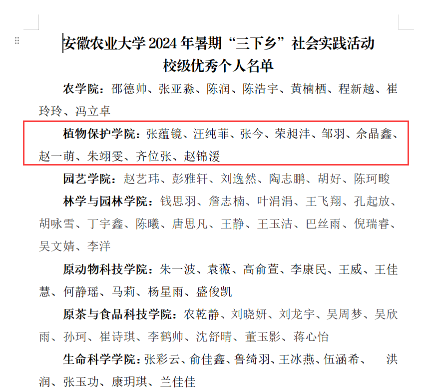 其中,22植保专业张蕴镜等10名同学获得“校级优秀个人”荣誉称号,校级团队《安徽农业大学赴绩溪党校“赓续红色血脉,厚植绩溪徽韵”暑期社会实践团》和校级专项团队《青春扬帆 行稳致远 安徽农业大学赴六安市林水寨三农实践团》获评“优秀”等次,全国重点团队《安徽农业大学赴六安以“红”为本 以“绿”振兴暑期社会实践团》和校级团队《智联乡村--安徽农业大学赴庐江县暑期三下乡》获评“良好”等次,还获得优秀调研报告二等奖3项等荣誉。