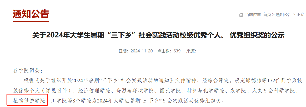 本网讯 近日,根据《关于组织开展2024年暑期“三下乡”社会实践活动的通知》等文件精神,校团委公示了2024年大学生暑期“三下乡”社会实践活动评比结果,我院获得优秀组织奖。
