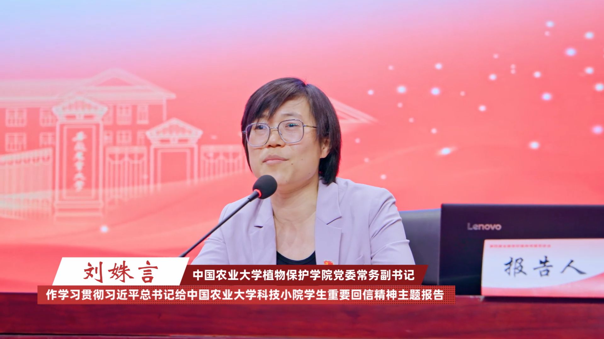 学院党委书记刘柳主持开幕式和大会报告环节。中国农业大学植物保护学院党委常务副书记刘姝言作了题为“学习贯彻习近平总书记给中国农业大学科技小院的学生重要回信精神”的主题报告。党的二十大代表、全国优秀共产党员、全国先进工作者、全国最美思政课教师、安徽师范大学马克思主义学院教授路丙辉作了题为“创造温暖环境 培育时代新人”的特邀报告。