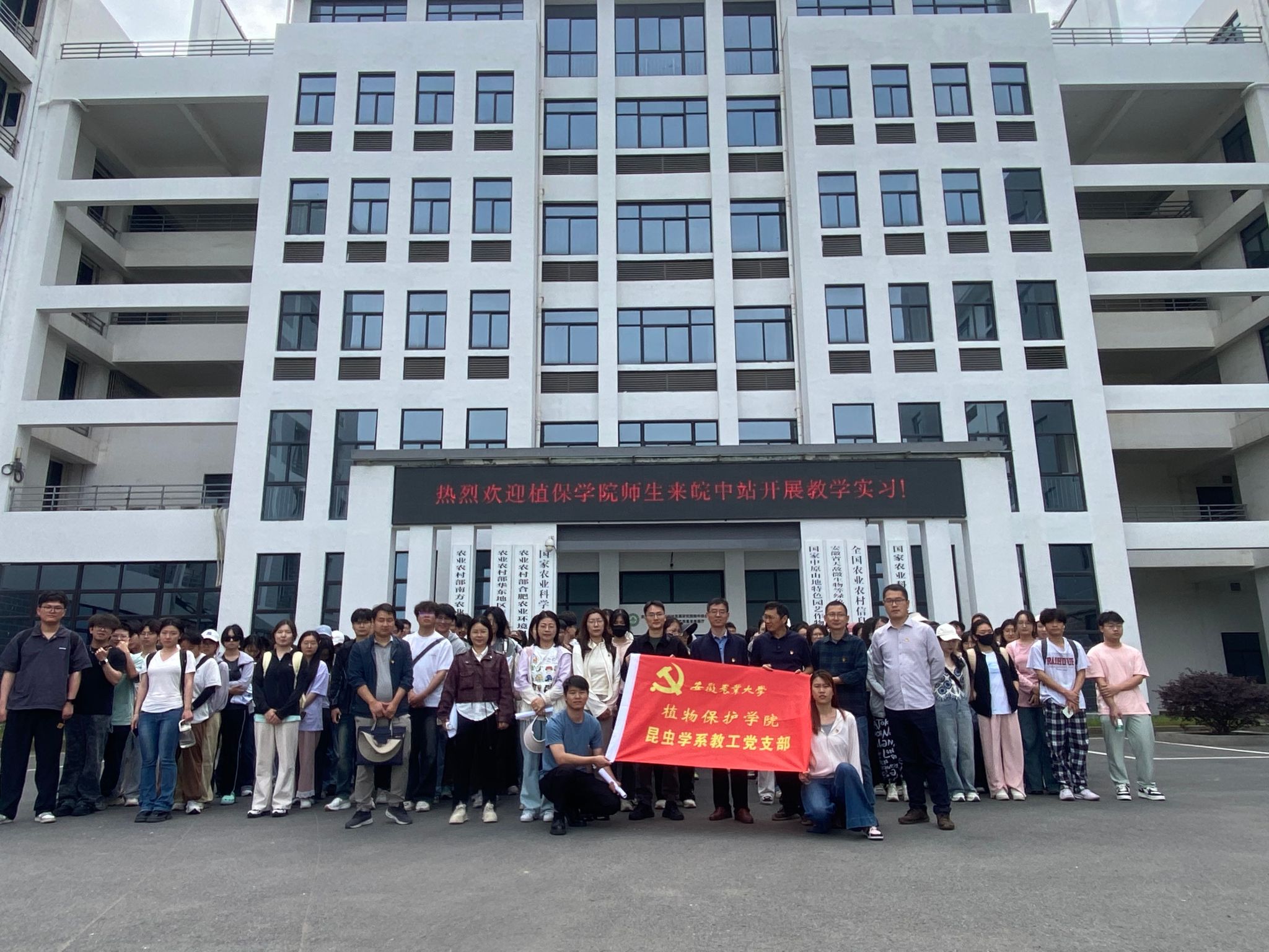 本网讯 4月27日上午,植物保护学院昆虫学系教工党支部组织教师带领2022级植物保护专业共6个班级的本科生赴安徽农业大学皖中试验站(庐江科技园)开展农业昆虫综合性大实验实践教学活动,本次实践活动共有师生近200人参加。