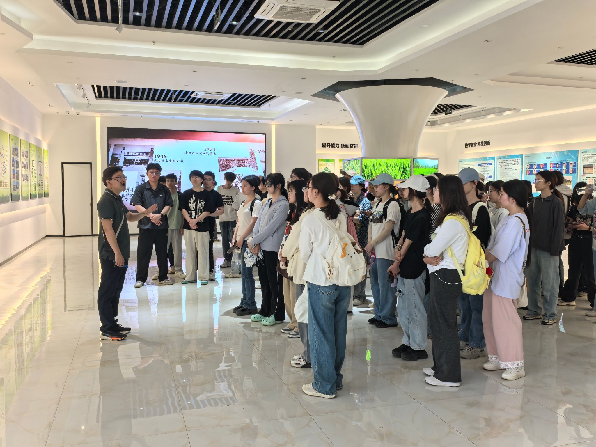 皖中试验站站长蒋兴川向师生们详细介绍了试验站的总体规划、建设情况,并带领师生一行参观试验站硬件建设、作物种植、功能实验室及运行情况。作为学校重要的教学实践和示范平台,试验站在科技创新、集成示范、推广应用和教育培训等方面发挥重要作用。