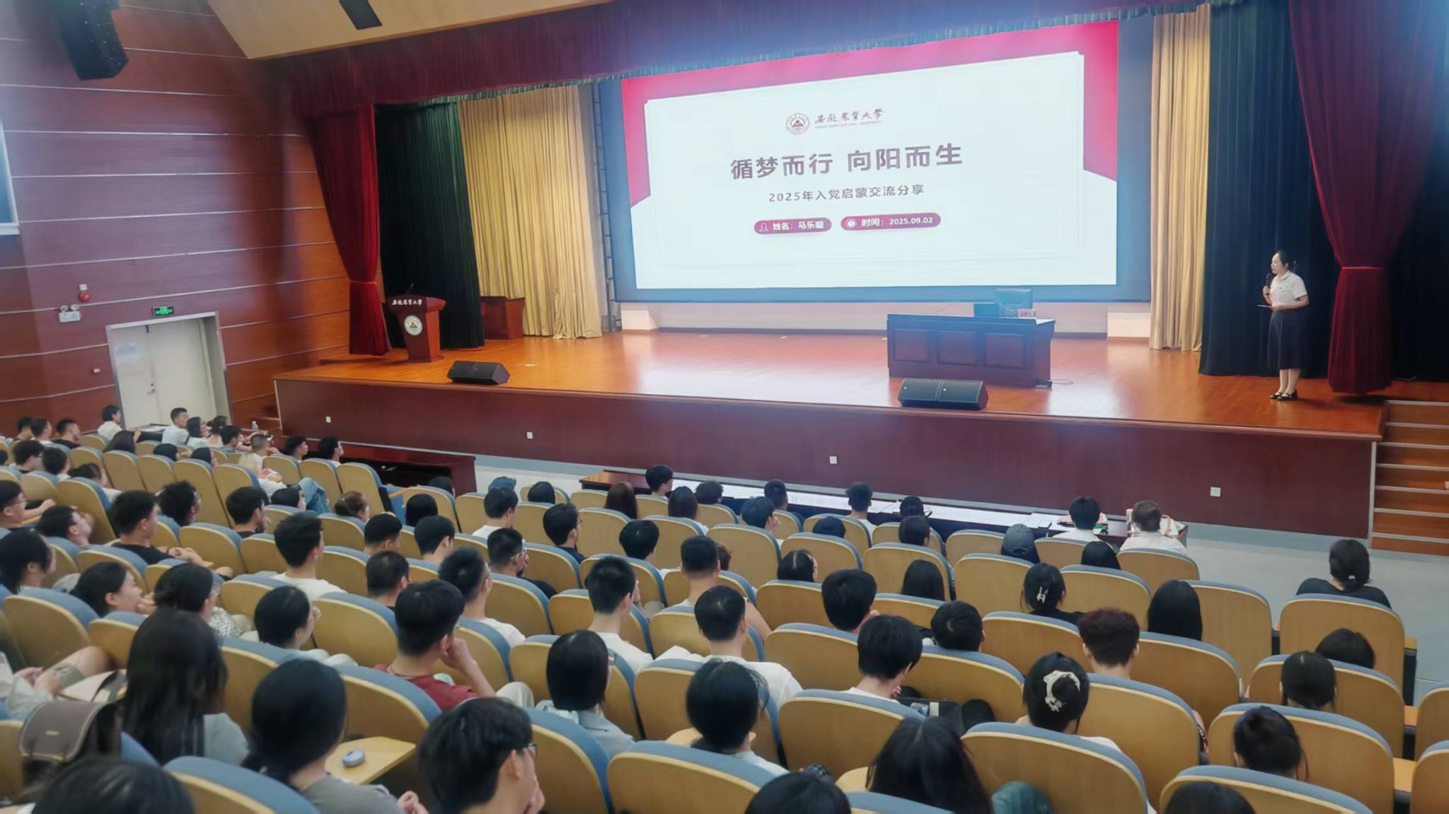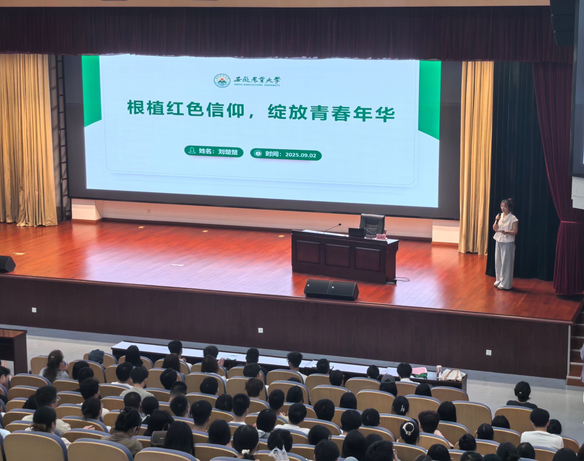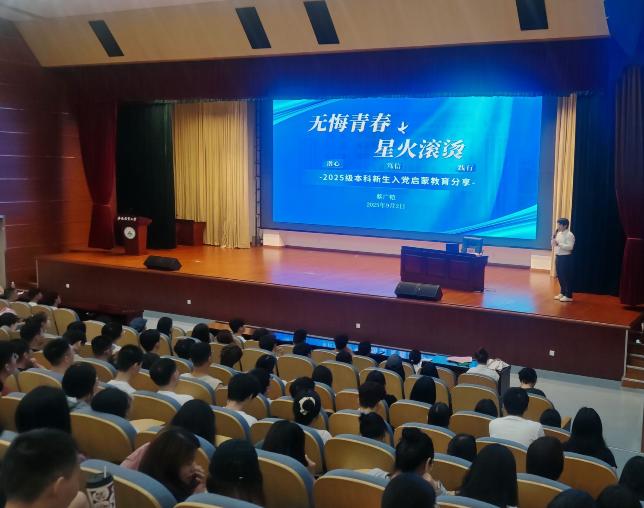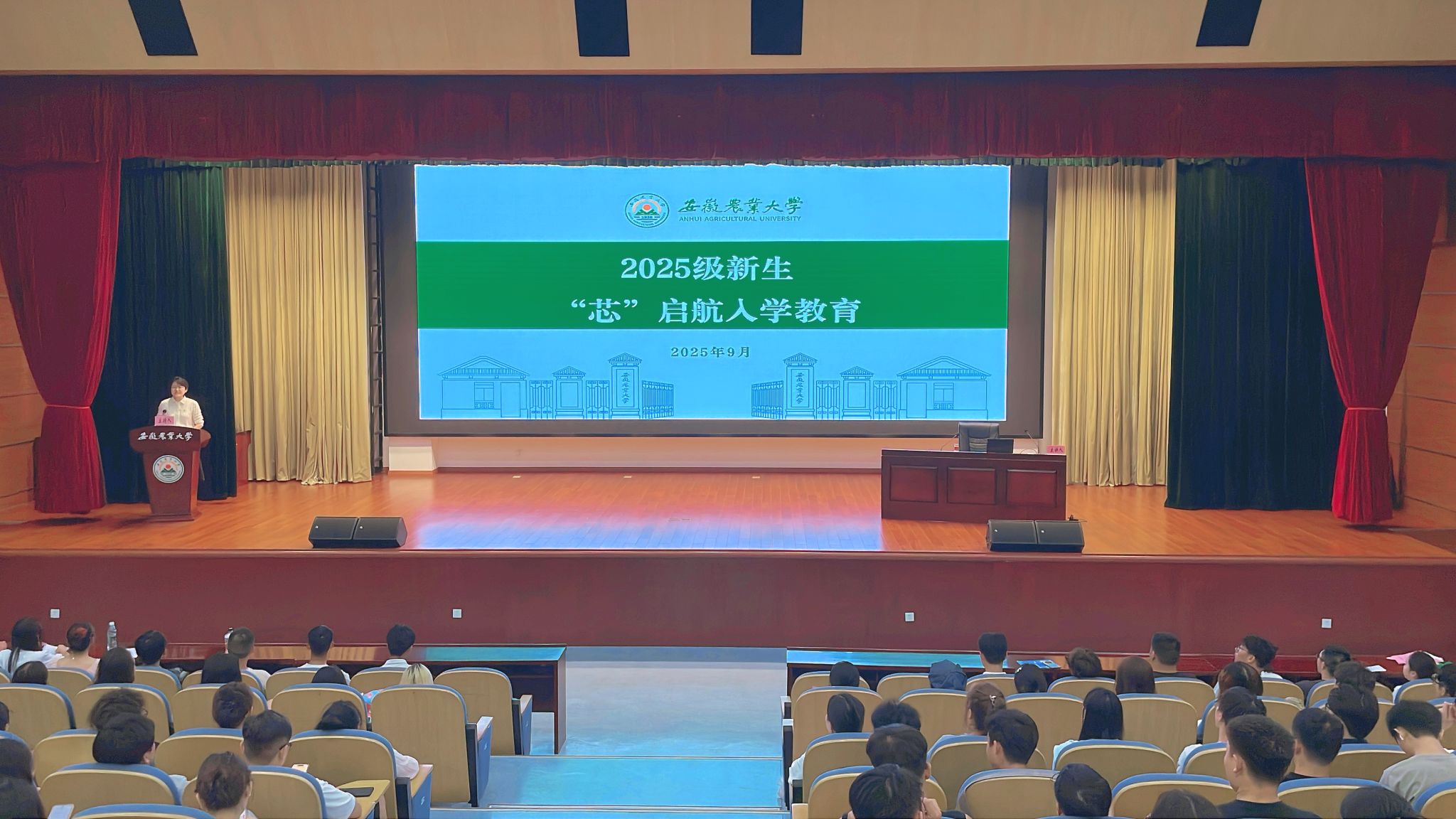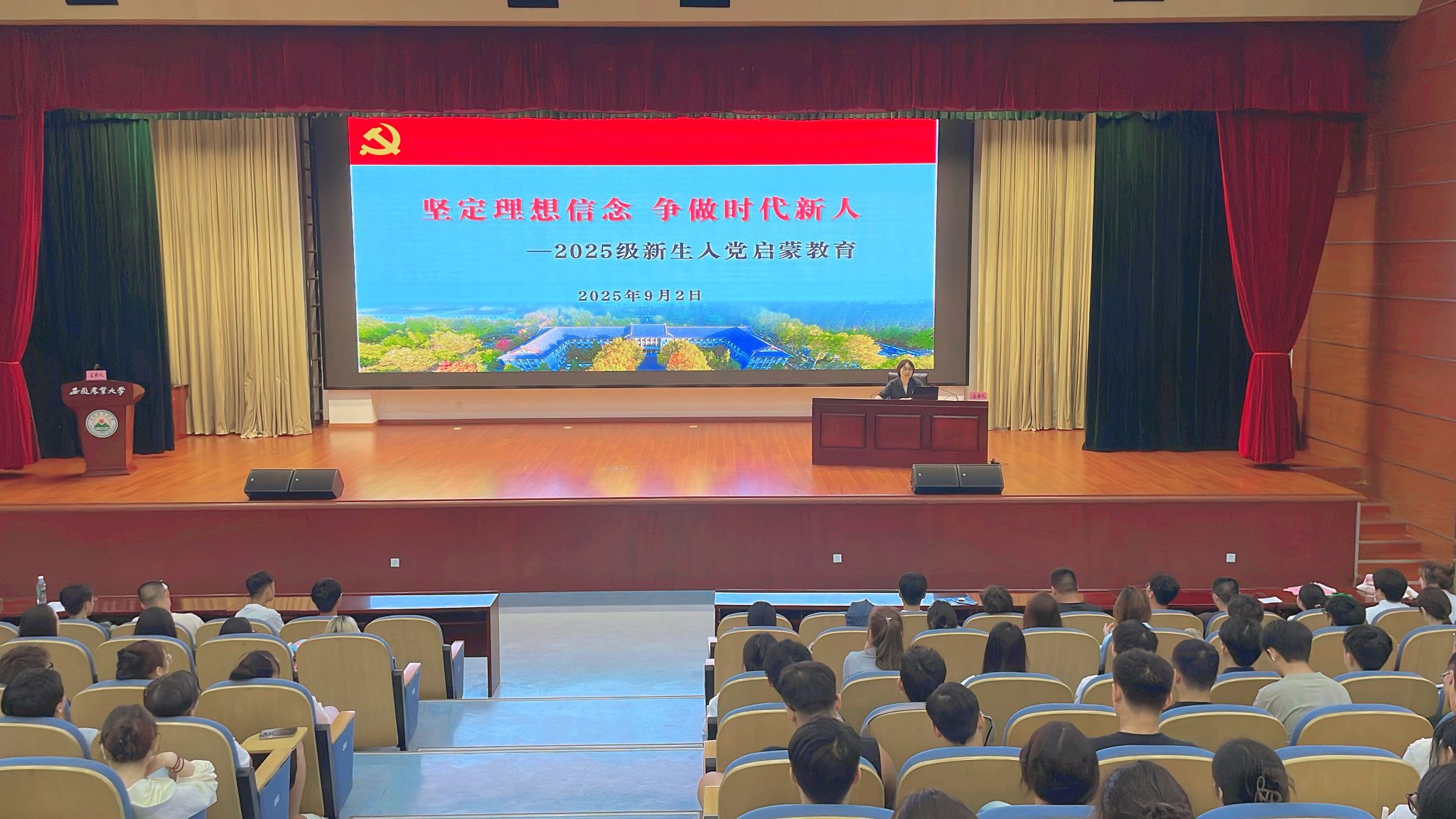 本网讯 为增进本科新生对中国共产党性质宗旨的认识,引导他们以实际行动积极向党组织靠拢,9月2日晚,安徽农业大学2025级本科生“‘芯’启航”入学教育系列课程第二讲“入党启蒙教育”在图书馆第一报告厅正式开讲。2025级全体新生通过“主课堂 + 分课堂”同步参与。本次课程由学校植物保护学院党委书记刘柳老师带领农、工、商三个类别学院学生党员代表主讲,校党委组织部副部长陶佳主持。