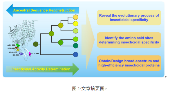 本网讯 苏云金芽胞杆菌(Bt)杀虫蛋白凭借特异靶向杀虫特性,是农业害虫绿色防控的关键技术支撑。但长期单一使用易使靶标害虫产生抗性,制约农业可持续发展,挖掘与目前广泛应用的Cry1Ab、Cry1Ac蛋白无交互抗性的高效广谱新型Bt杀虫蛋白成为迫切需求。此前数十年,无论是自然菌株筛选还是蛋白质工程改造,均未获得可媲美Cry1Ab、Cry1Ac蛋白的新型杀虫蛋白,成为行业研发瓶颈。我院生物防治创新团队最新研究取得突破,依托与Cry1A蛋白无交互抗性的Cry2蛋白家族,采用祖先序列重建技术,追溯Bt杀虫蛋白活性演变历程,发掘高效杀虫蛋白及关键功能位点,成功设计出高效广谱新型杀虫蛋白,为该领域研究提供新范式(图1)。