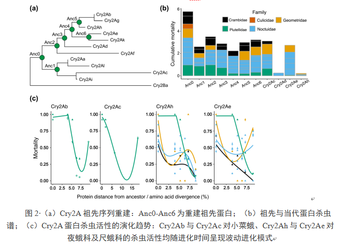 据悉,联合团队首次将祖先序列重建(Ancestral Sequence Reconstruction,ASR)技术系统应用于Bt杀虫蛋白研发领域(图2)。研究团队以与Cry1A蛋白无交互抗性的Cry2蛋白家族为研究对象,通过系统追溯Cry2A家族的进化历程,成功重建7个祖先基因,并在大肠杆菌中实现可溶性表达。生物活性测定结果展现出颠覆性突破:“复活”的祖先蛋白(尤其Anc0)表现出优异的广谱杀虫活性,对所有测试的9种鳞翅目害虫(涵盖夜蛾科、尺蠖蛾科、螟蛾科)及双翅目的白纹伊蚊均具备杀虫活性;而现有现代Cry2A毒素(如Cry2Ae、Cry2Ah)仅对3~5种鳞翅目害虫有效,宿主范围显著狭窄。这一发现打破了“现代蛋白功能优于祖先蛋白”的传统认知,揭示祖先蛋白是一座未被开发的“广谱杀虫蛋白资源库”。更具科学价值的是,团队首次发现Cry2A蛋白呈现“波动进化”模型:通过分析Cry2A毒素效力随进化时间的变化规律,发现其对夜蛾科、尺蠖蛾科等关键农业害虫的毒性并非线性增强,而是呈现“高效 - 低效 - 再高效”的非线性波动特征。进一步数据分析表明,这种波动可能源于蛋白在演化过程中获得针对同种害虫的不同作用靶点,这一核心结论为现代害虫抗性治理提供了颠覆性思路,即通过追溯祖先蛋白靶点多样性,设计识别位点不同的新型杀虫蛋白,从新角度解决当代Bt蛋白使用中出现的害虫抗性问题。