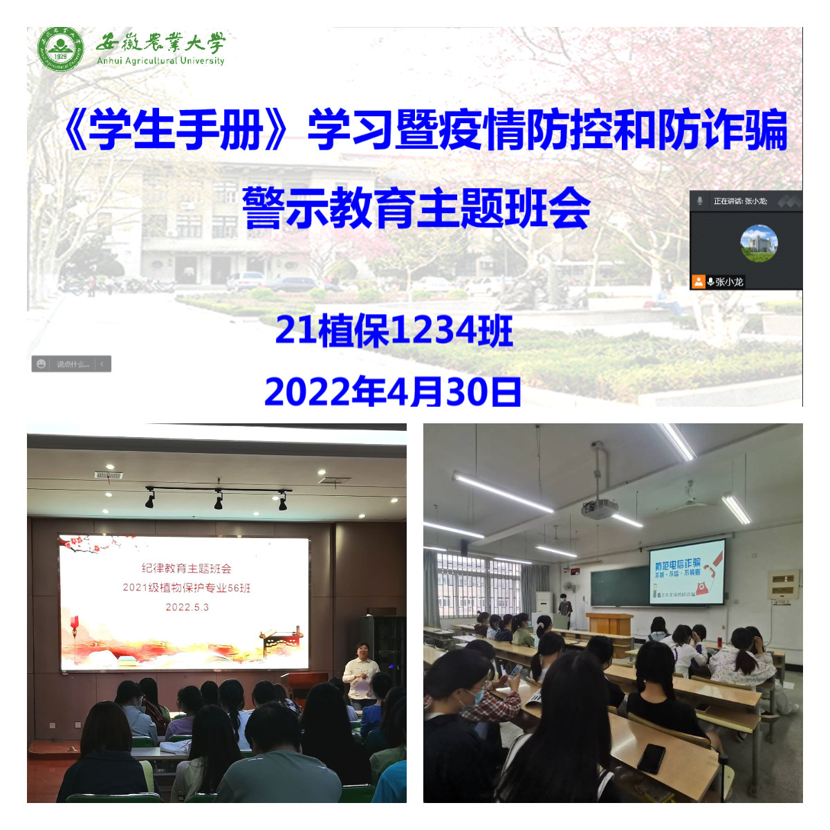 本网讯 为进一步加强学生校纪校规教育、疫情防控期间安全教育以及防诈骗警示教育,引导大学生养成良好的学习生活习惯、保持积极乐观向上的心态。根据学校相关通知要求和学院学生实际,植物保护学院于4月底至5月初组织开展最新版《学生手册》暨疫情防控和防诈骗警示教育主题班会。我院专兼职辅导员结合班级实际,采用线上线下相结合的方式,主要由辅导员导学、学生干部领学、个人自学结合等方式,开展13场次,参加人数880余人。