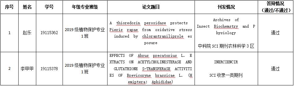 植物保护学院关于2023年推免(论文)公开答辩结果的公示 发布时间:2022-09-15 浏览次数: 根据《安徽农业大学推荐优秀应届本科毕业生免试攻读硕士学位研究生工作实施办法》和学院推免要求,9月15日,学院组织专家组对申报2023年研究生推免资格学生的科研论文,围绕创新质量、个人贡献和专业相关度进行公开答辩。经专家组现场评议,两篇论文均符合推免要求,答辩予以通过,结果见下表。 现将答辩结果进行公示。如有异议,请在9月16日下午17点前与学院教学秘书王成阳老师联系。电话:0551-65786312。 植物保护学院 2022年9月15日