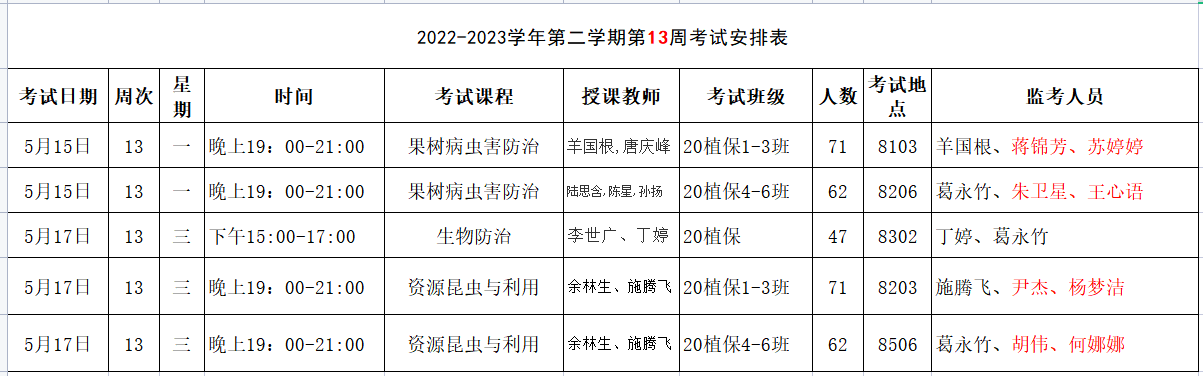 2022-2023学年第二学期第13周考试安排表