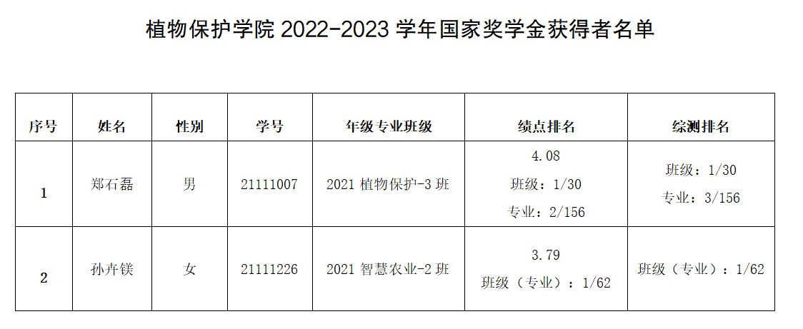 根据《安徽农业大学本科学生国家奖学金、国家励志奖学金、国家助学金评审办法》和《关于开展2022-2023学年国家奖学金、国家励志奖学金和2023-2024学年国家助学金评审工作的通知》,经过学生申请、班级评审、学院奖助学金评审领导小组审核和学院党委会研究决定,现将2022-2023学年本科生国家奖学金获得者名单予以公示。公示期为:2023年9月26日至10月9日。公示期内,若有异议,请与院党政办张小龙老师联系,电话:0551-65780720。
