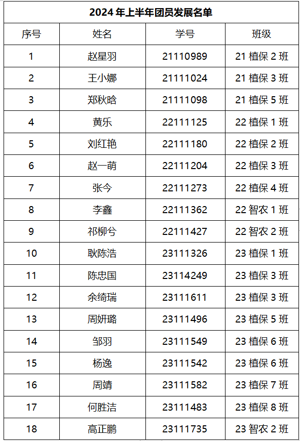 植物保护学院2024年上半年团员发展名单公示 发布时间:2024-04-23 浏览次数: 根据《植物保护学院关于做好2024年发展团员工作的通知》等工作要求,经学生个人申请、团课学习和培训、入团考试和答辩、辅导员意见考察、学院审核评选等程序,现将学院2024年上半年团员发展名单公示如下:(排名不分先后)如有异议,请在公示期内向研究生公寓B楼1503办公室反映。公示期:2024年4月23日至25日联系人:团委张老师、班级辅导员联系电话:0551-65780720植物保护学院团委2024年4月23日
