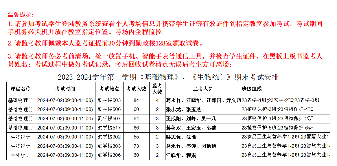 【考试安排】2023-2024学年第二学期第19周公共课考试监考安排表