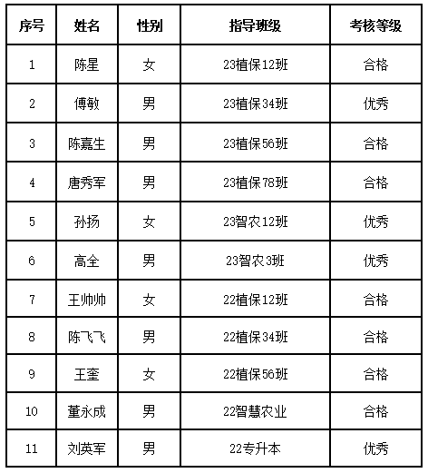 关于植物保护学院2023-2024学年本科生班级班主任考核结果公示 发布时间:2024-09-12 浏览次数: 根据《学校本科生班主任选聘工作实施办法》和学院本科生班主任岗位职责等精神,经学院研究决定,现将我院2023-2024学年本科生班级班主任考核结果公示如下,公示期为2024年9月12日至16日。公示期内如有异议,请联系党政办裴志远,联系方式:0551-65786321。