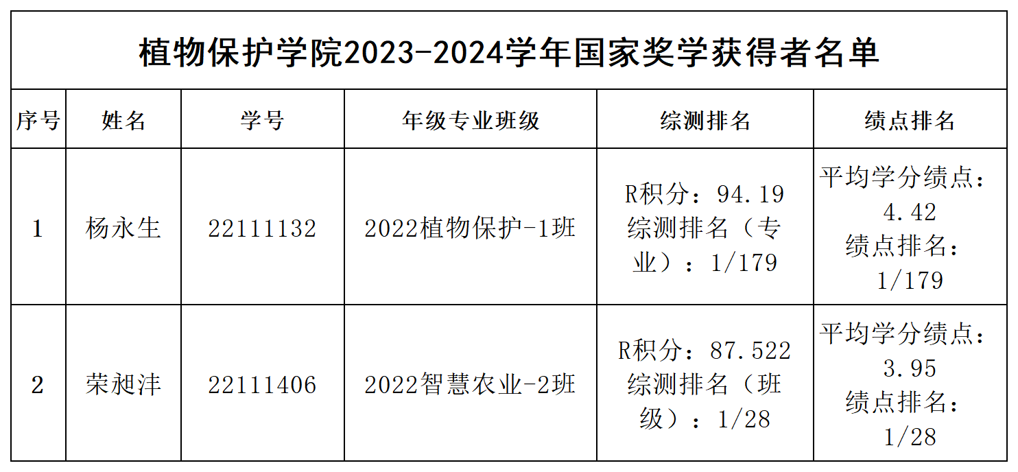 根据《安徽农业大学本科学生国家奖学金、国家励志奖学金、国家助学金评审办法》和《关于开展2023-2024学年国家奖学金、国家励志奖学金和2024-2025学年国家助学金评审工作的通知》,经过学生申请、班级评审、学院奖助学金评审领导小组审核和学院党委会研究决定,现将2023-2024学年本科生国家奖学金获得者名单予以公示。公示期为:2024年9月28日至9月30日。公示期内,若有异议,请与院党政办裴志远老师联系,电话:0551-65786321。