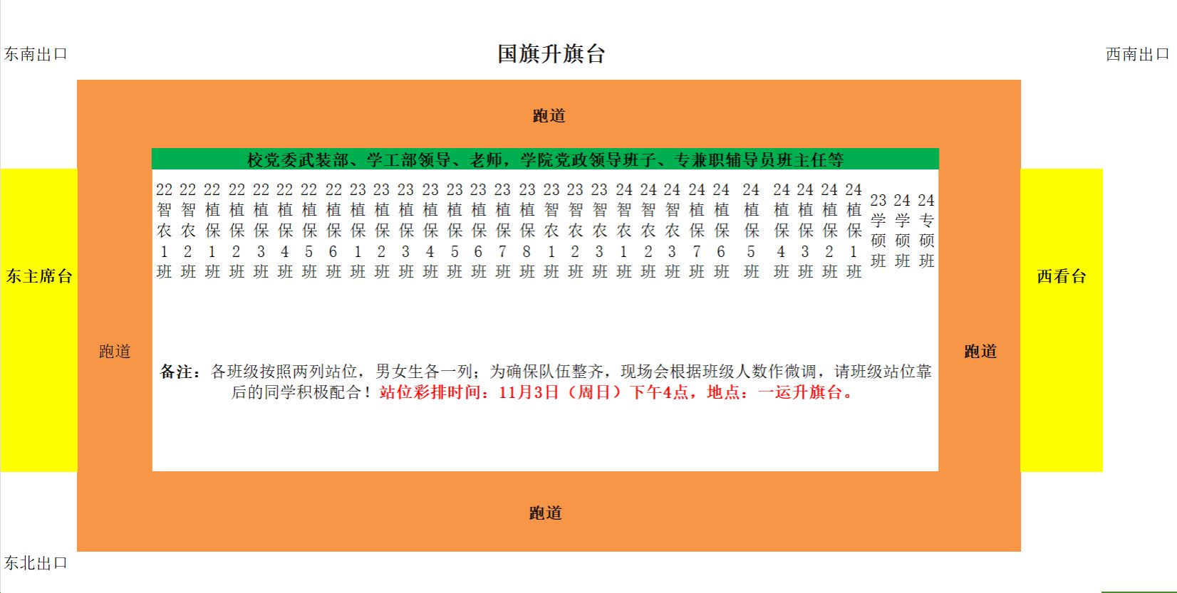 (11月3日,即本周日下午4:00在第一运动场升旗台下彩排,请节目组全体人员到场参加,各非毕业班班长或负责人至少1人到场参加,确定站位等注意事项)