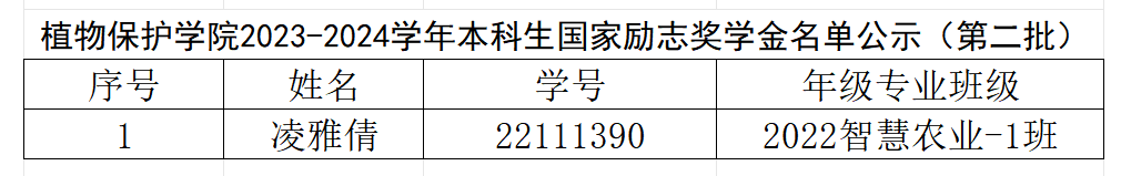 根据《安徽农业大学关于做好2024年本科生国家奖助学金评定工作的补充通知》和《安徽农业大学本科学生国家奖学金、国家励志奖学金、国家助学金评审办法》(校学发〔2023〕12号)等文件要求,经过学生申请、班级评审、学院奖助学金评审领导小组审核和学院审核,现将2023-2024学年学院本科生国家奖学金、国家励志奖学金补充名单予以公示。(因第二批次国家奖学金追加名额导致的一名国家励志奖学金名额空缺,结合学校文件精神,学院研究决定依次开展递补,递补名单如下)