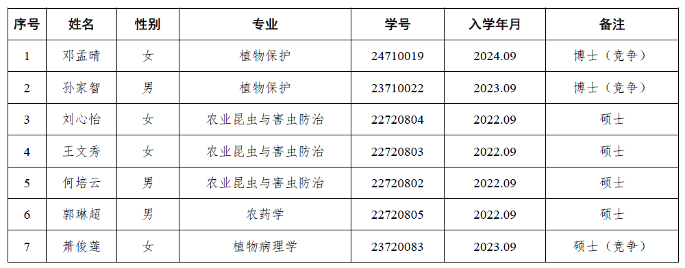 植物保护学院2024年第二批研究生国家奖学金拟推荐名单公示 发布时间:2024-11-05 浏览次数: 根据学校《关于开展2023-2024学年第二批研究生国家奖学金评审工作的通知》等相关文件精神,经过个人申请、学院初评、公开答辩、学院研究生奖学金评审工作委员会评议,确定排序结果。现将评审结果予以公示。公示时间为2024年11月5日---2024年11月11日。公示期内,对以上评审结果如有异议,可直接到学院办公室(研究生B楼1503室)或以电话、电子邮件的方式实名反映。联系电话:0551-65786321电子邮箱:949203812@qq.com植物保护学院2024年11月5日