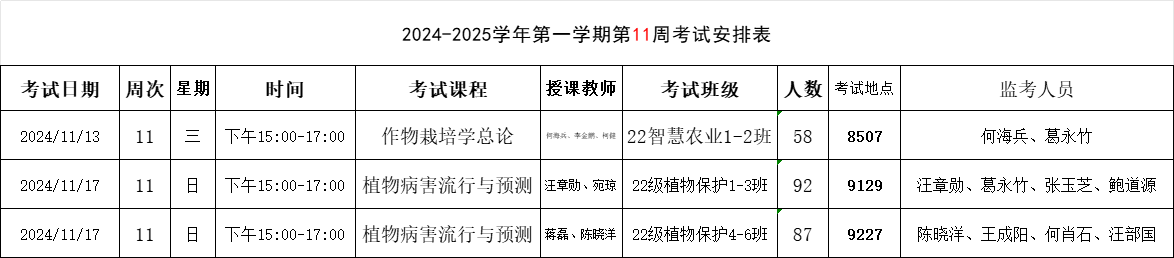 【考试安排】植物保护学院2024-2025学年第一学期第11周考试安排表
