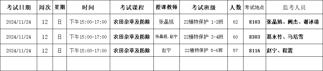 【考试安排】植物保护学院2024-2025学年第一学期第12周考试安排表